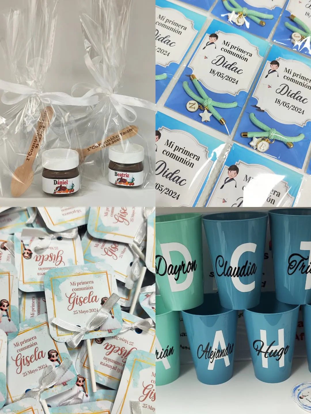 Detalles para invitados de comunión personalizados y originales. Regalos únicos con nombre del niño o niña y fecha de la comunión.