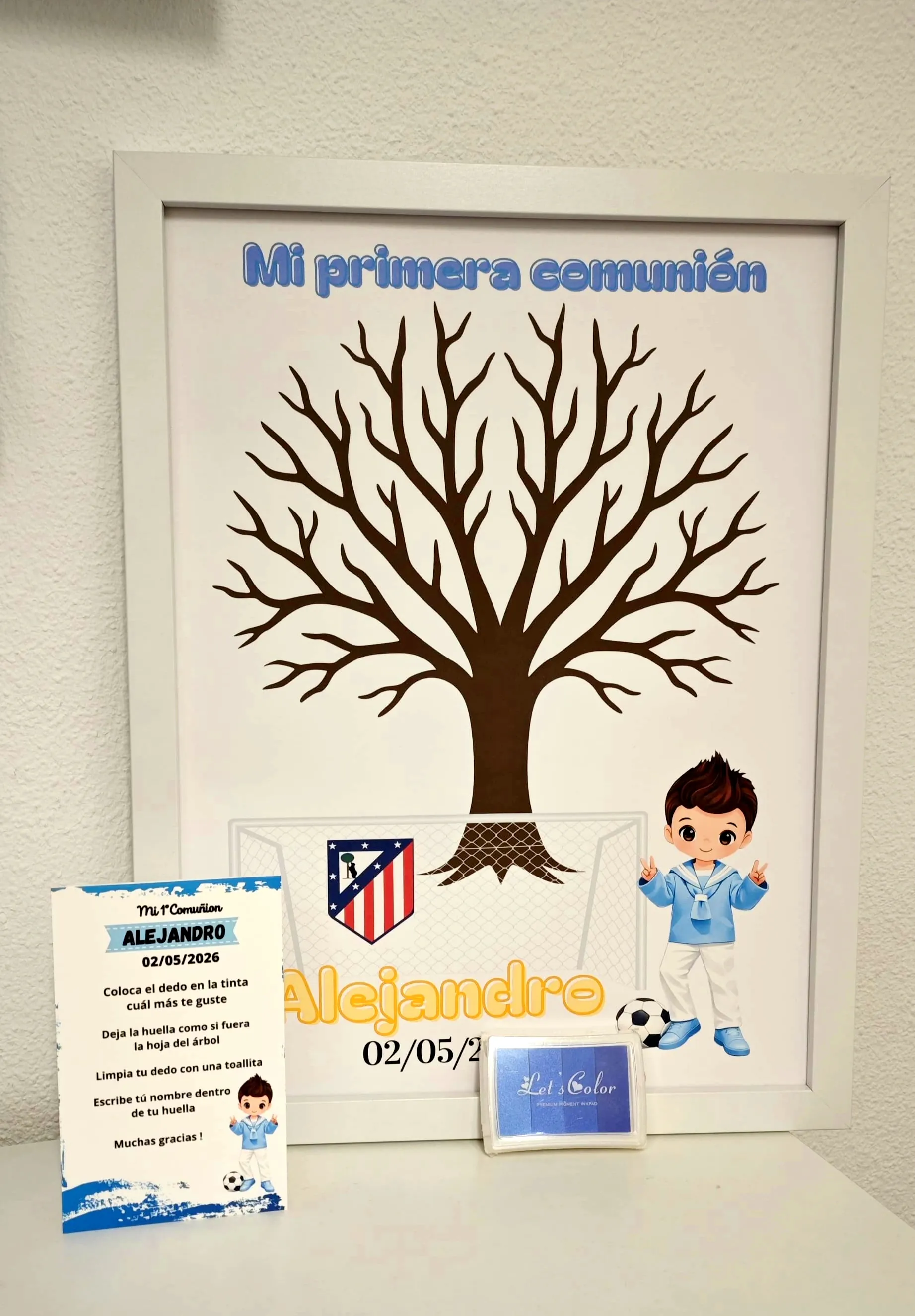 Árbol de huellas para primera comunión niño con temática fútbol. Los invitados dejan su huella creando un recuerdo único y personalizado.