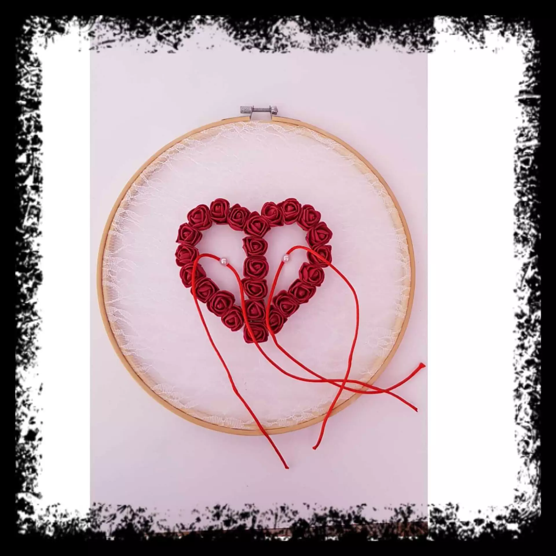 Decorado con encaje y un corazon realizado con rosas de espuma y 2 perlas.
