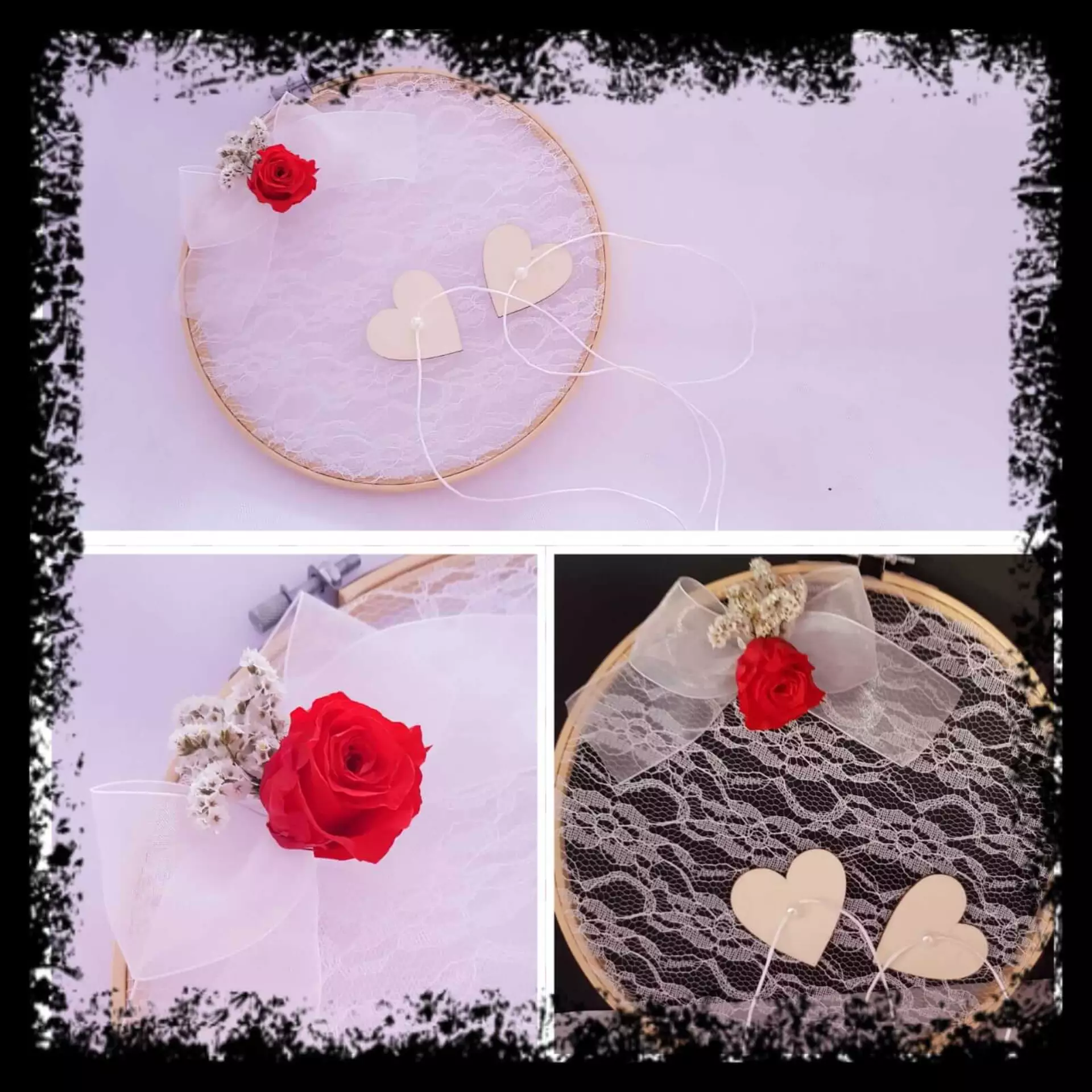 Decorado con encaje , flores naturales secas, rosa preservada y 2 corazones de madera