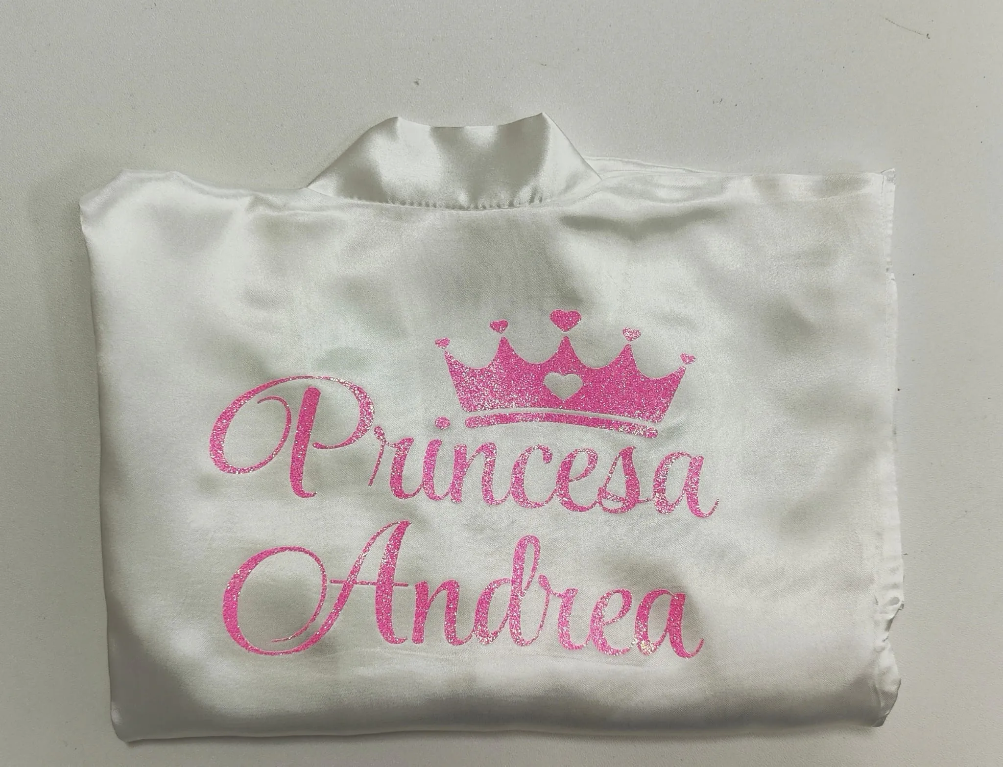Bata de comunión personalizada en satén blanco, con diseño en vinilo glitter.