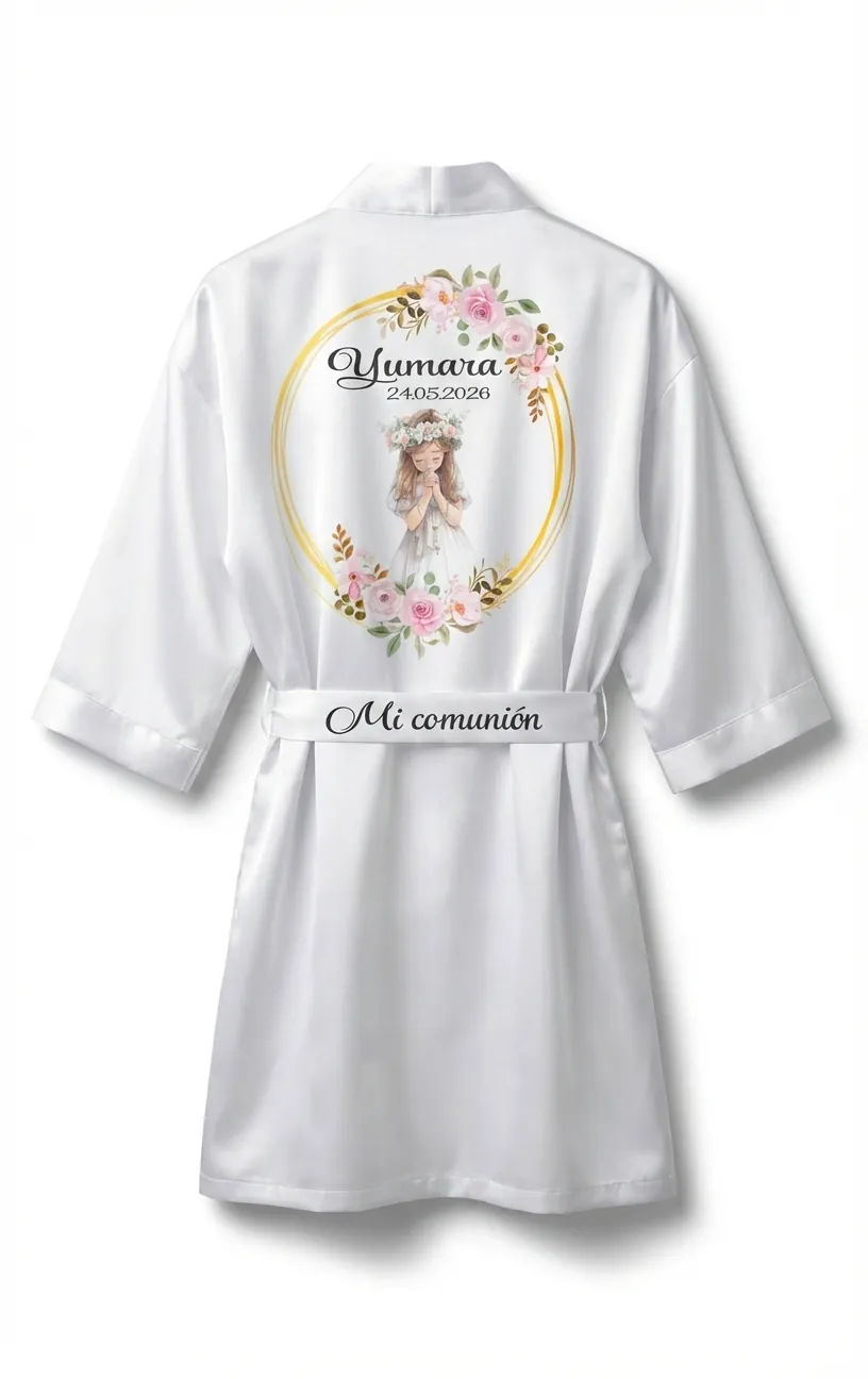 Bata de comunión personalizada en satén blanco, con diseño elegante impreso mediante técnica DTF (Direct to Film).