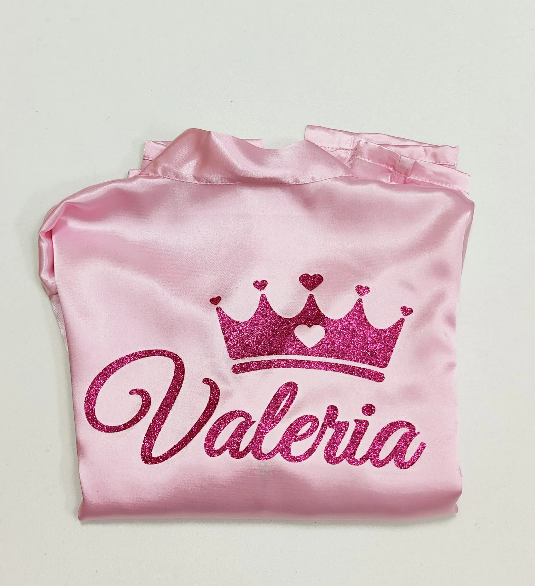 Bata de comunión personalizada en satén rosa, con diseño en vinilo glitter.