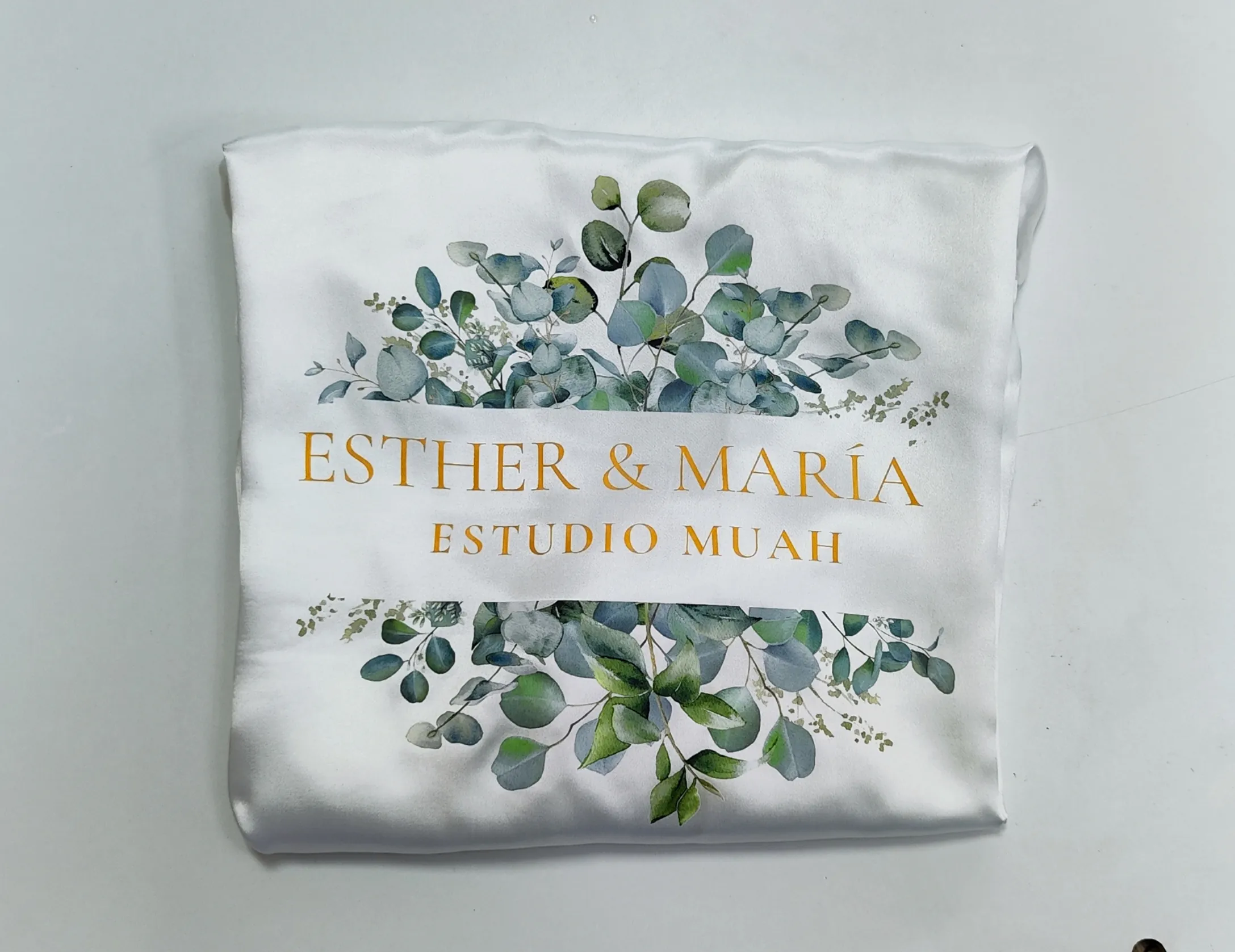 Bata personalizada en satén blanco con impresión DTF diseño eucalipto.