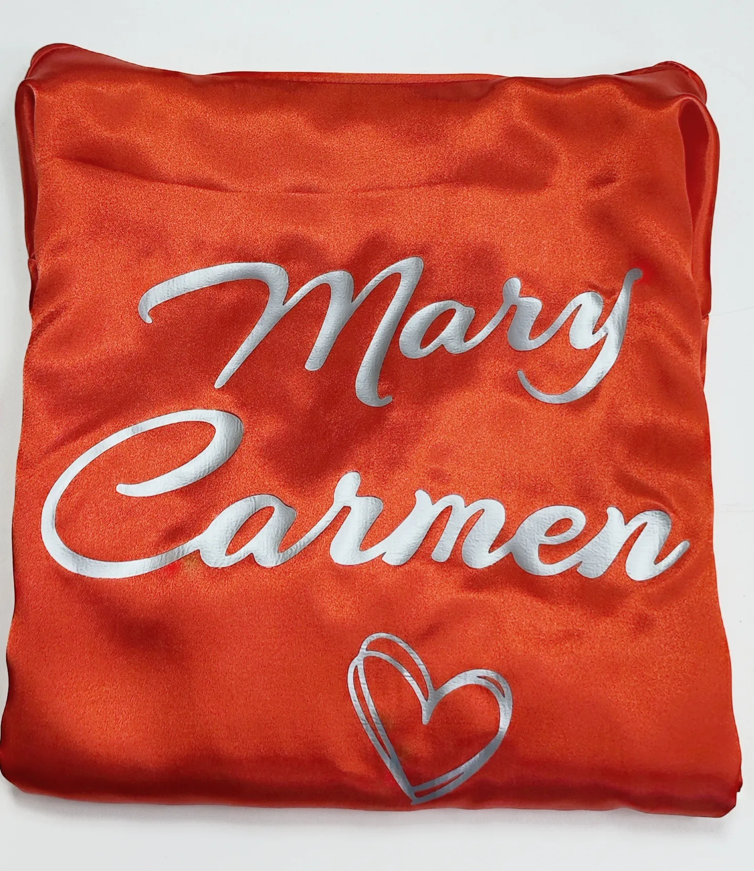 El diseño incluye nombre personalizado mediante vinilo y corazón decorativo. Material satén suave y elegante en color vibrante.