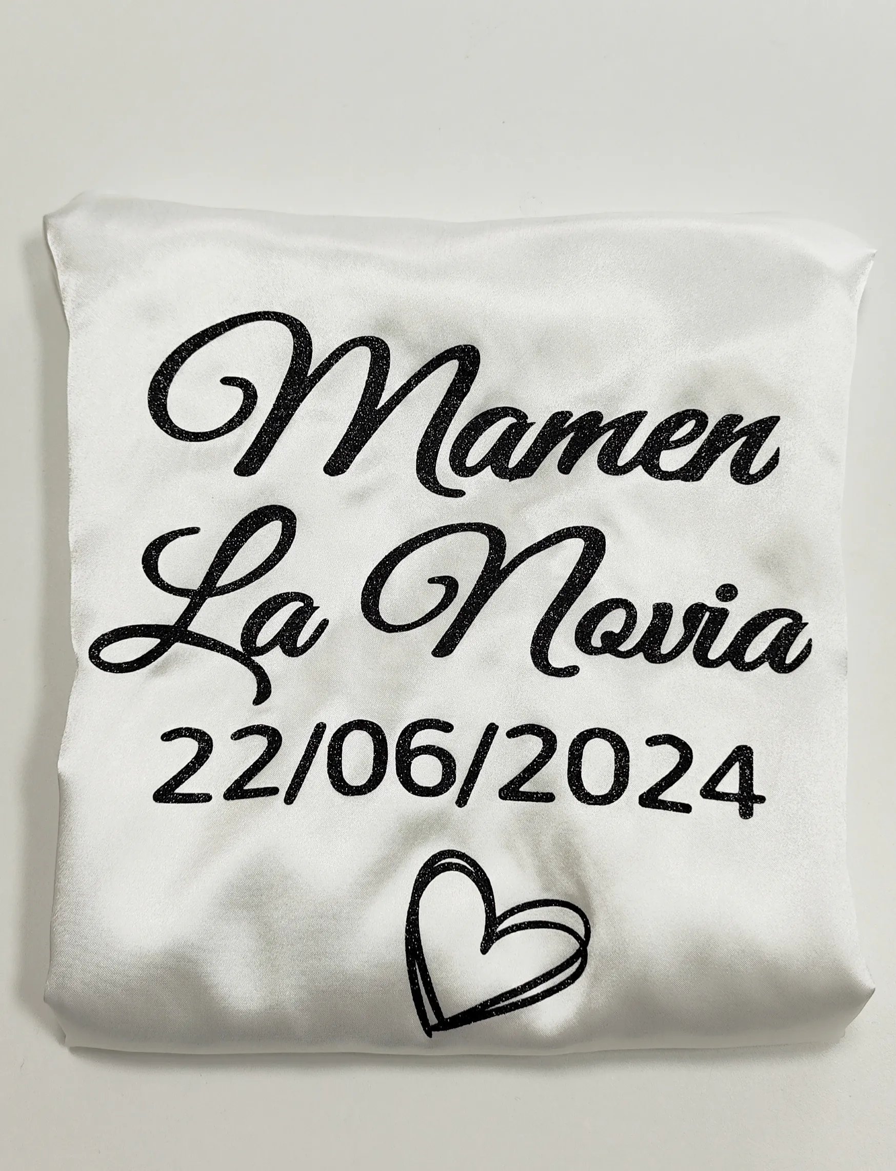 El diseño incluye el texto “La novia” con nombre y fecha personalizados mediante vinilo y corazón decorativo. Material satén suave y elegante.