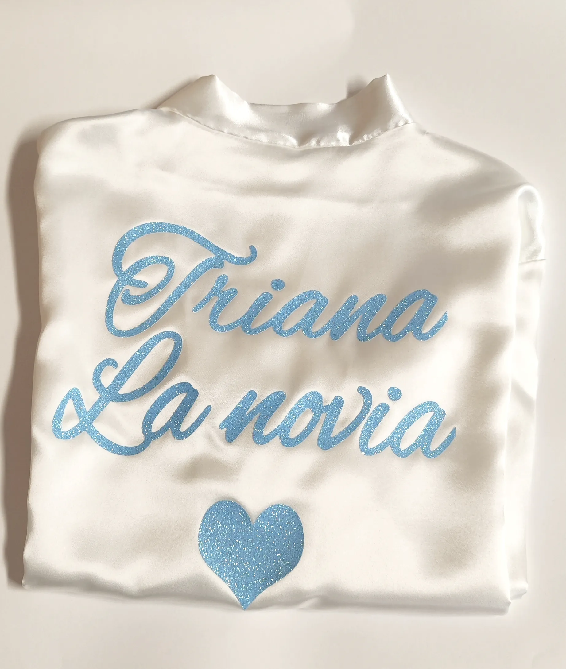 El diseño incluye el texto “La novia” con nombre personalizado mediante vinilo y corazón decorativo. Material satén suave y elegante.