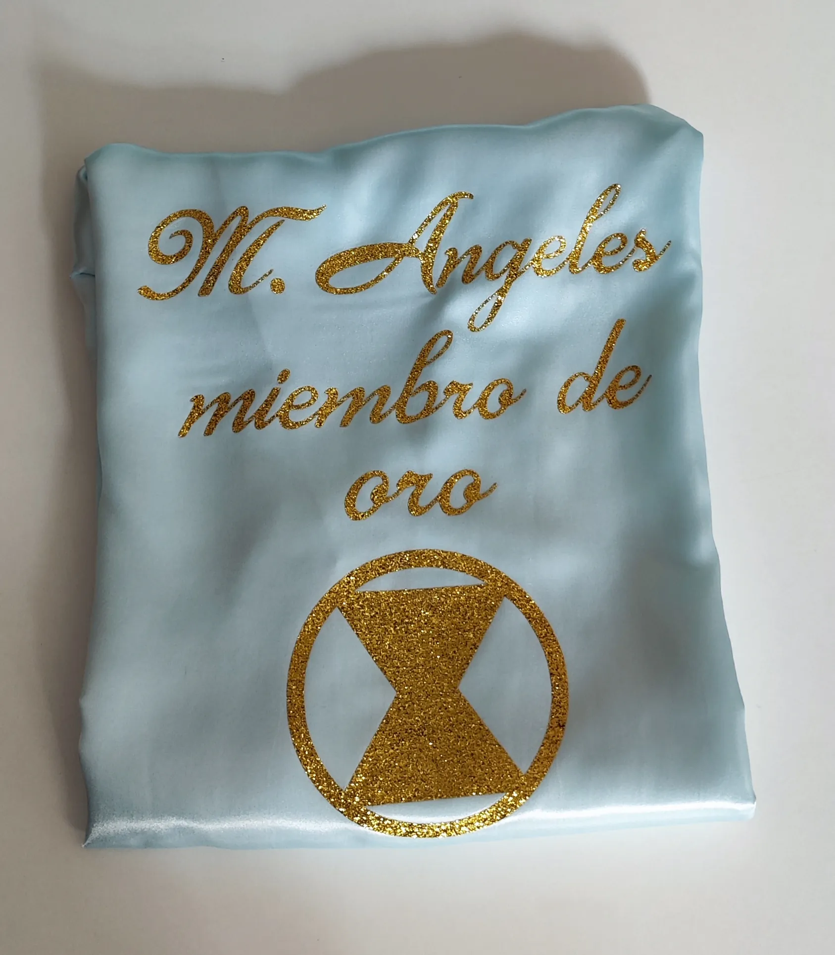 El diseño incluye texto personalizado mediante vinilo dorado glitter y logo decorativo. Material satén suave y elegante.