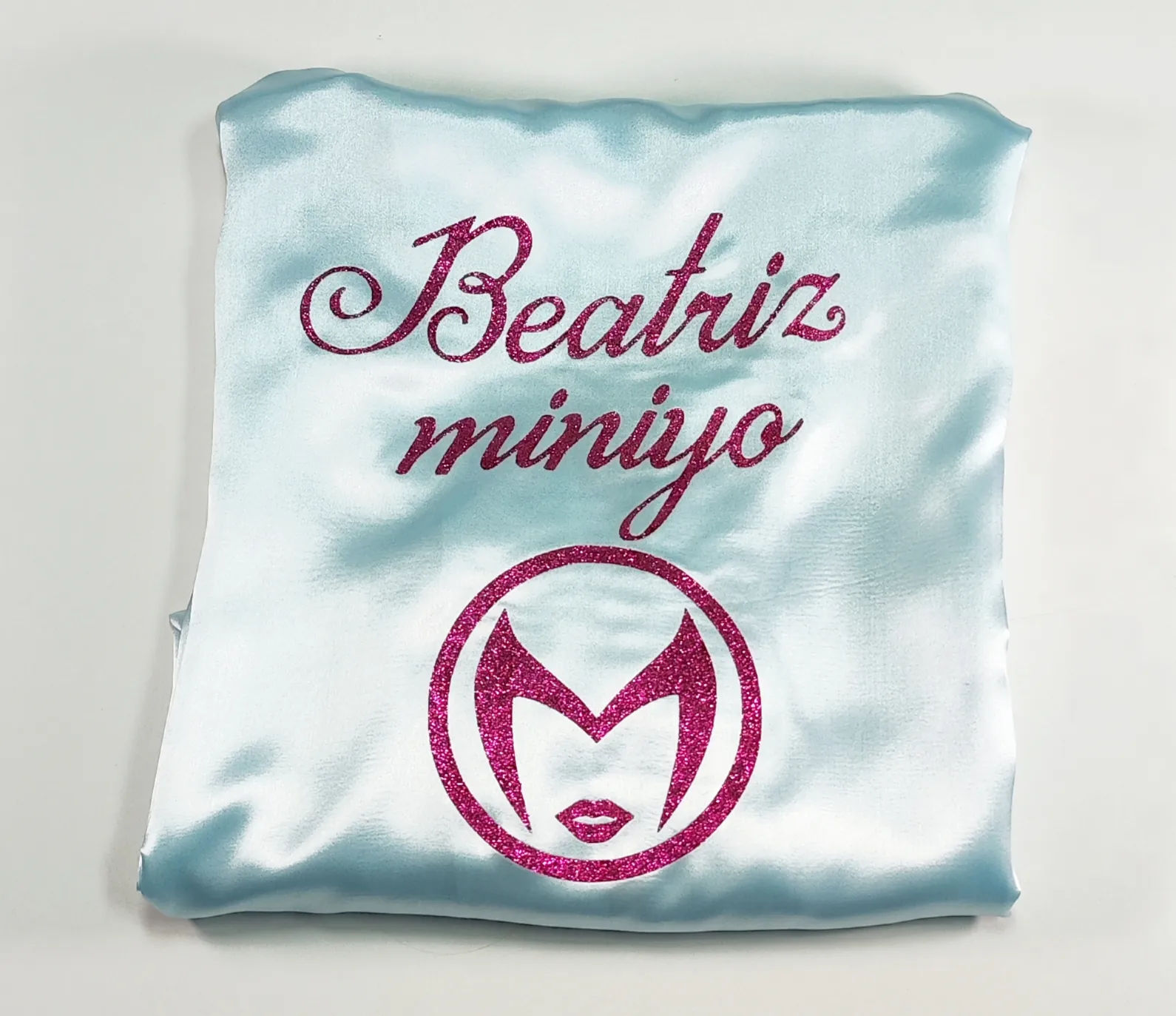 El diseño incluye texto personalizado mediante vinilo fucsia glitter y logo decorativo. Material satén suave y elegante.