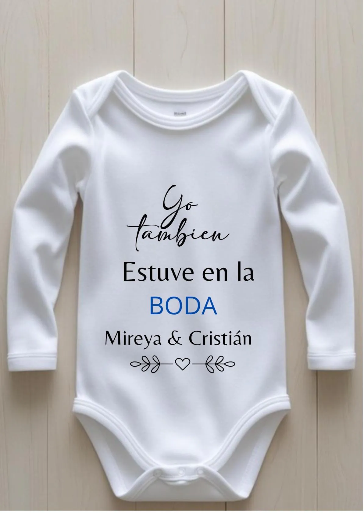 Body de bebé de manga larga en algodón 100%, con la frase fija “Yo también estuve en la BODA”, en un diseño elegante y actual.