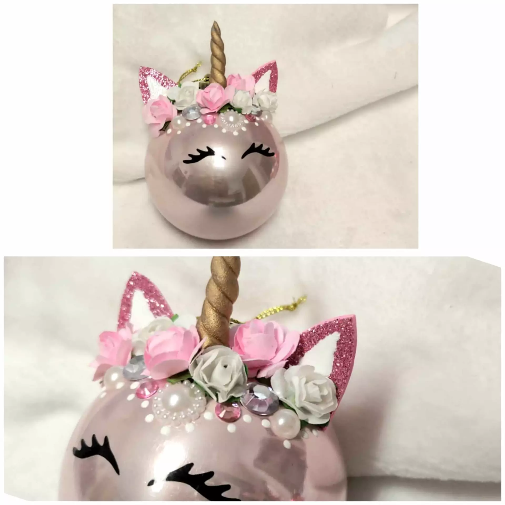 Bola de navidad unicornio decorada con flores, brillantes, perlas y pintura 3d.