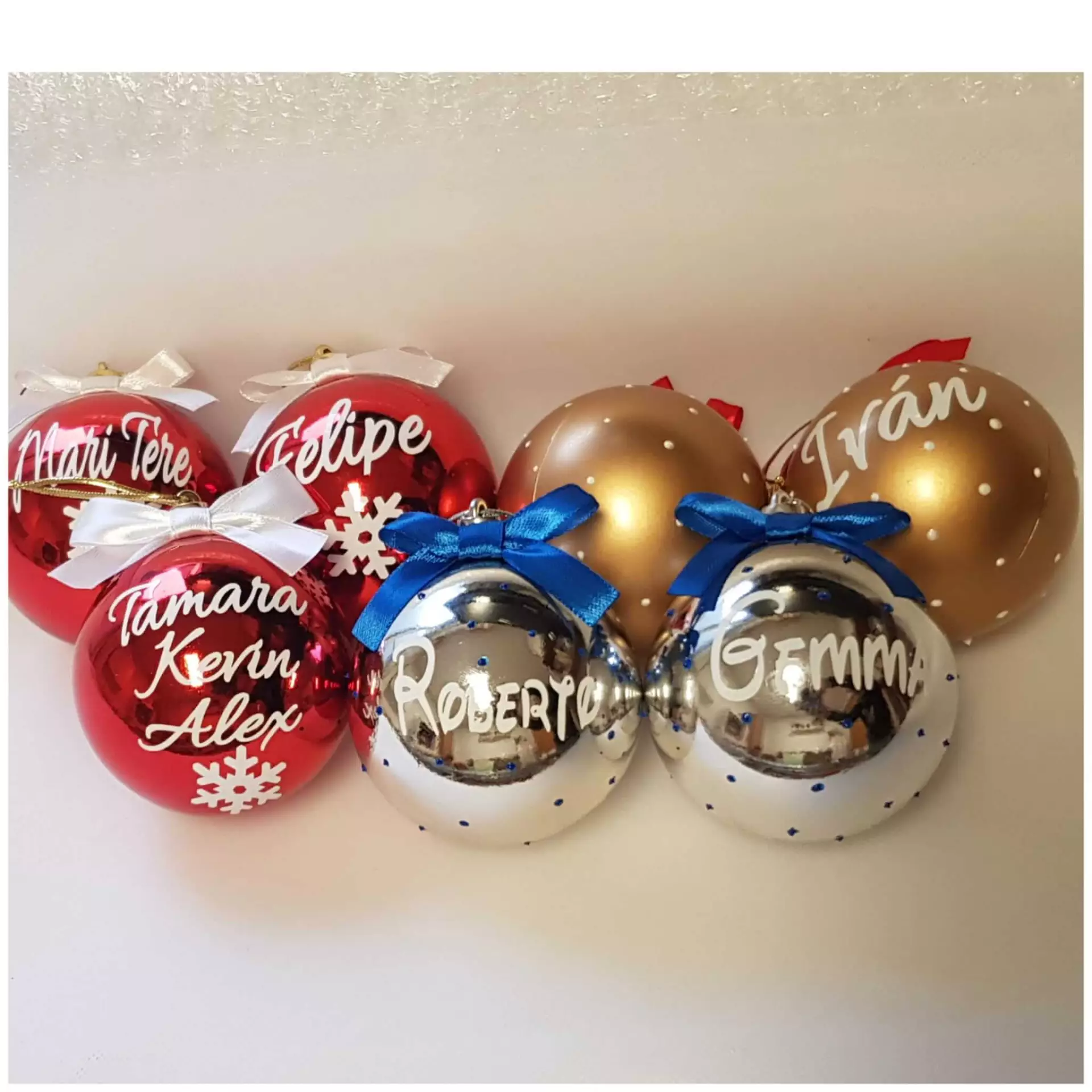 - Bolas decoradas con pegatinas y un lazo de satin u organza de diferentes colores.