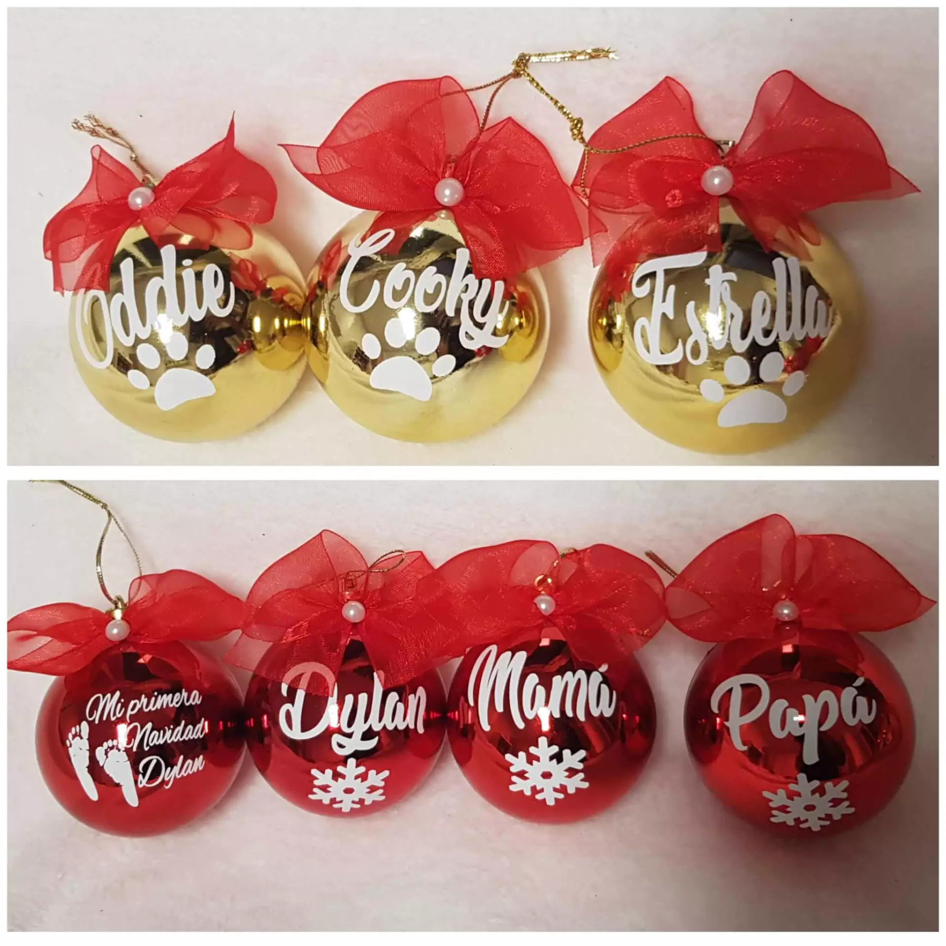 - Bolas decoradas con pegatinas y un lazo de satin u organza de diferentes colores.