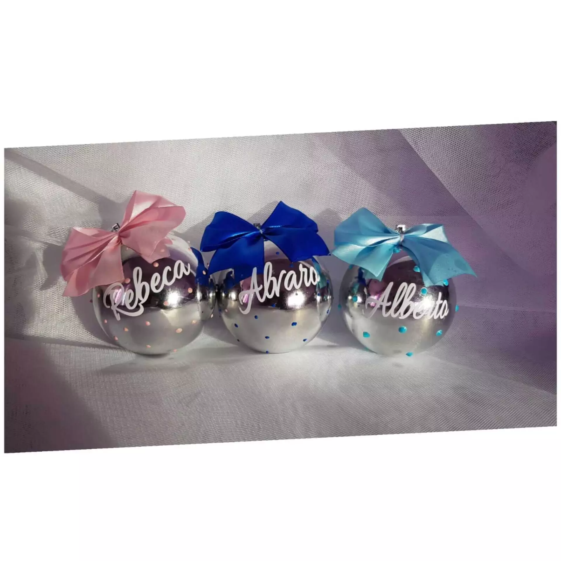- Bolas decoradas con pegatinas y un lazo de satin u organza de diferentes colores.