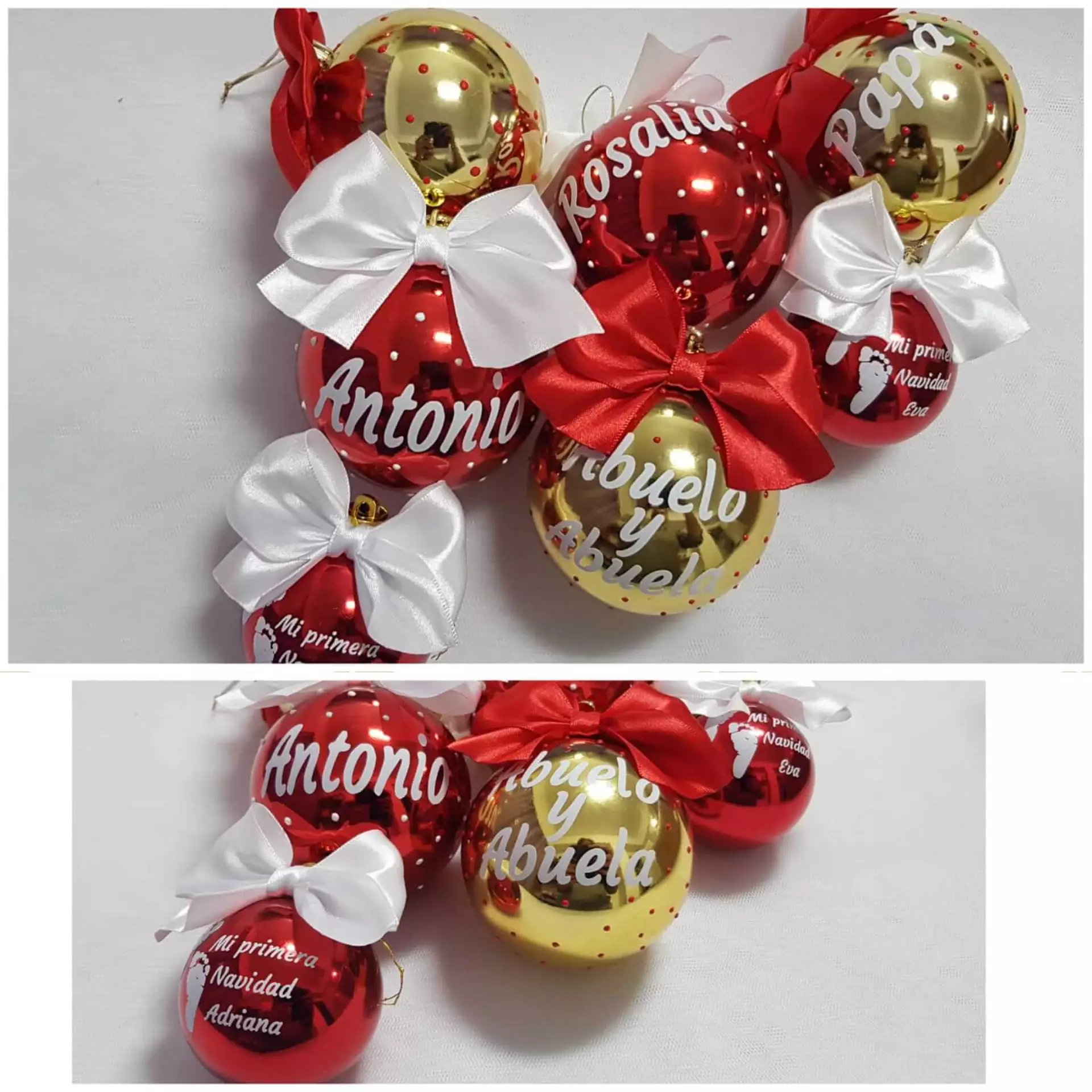 - Bolas decoradas con pegatinas y un lazo de satin u organza de diferentes colores.
