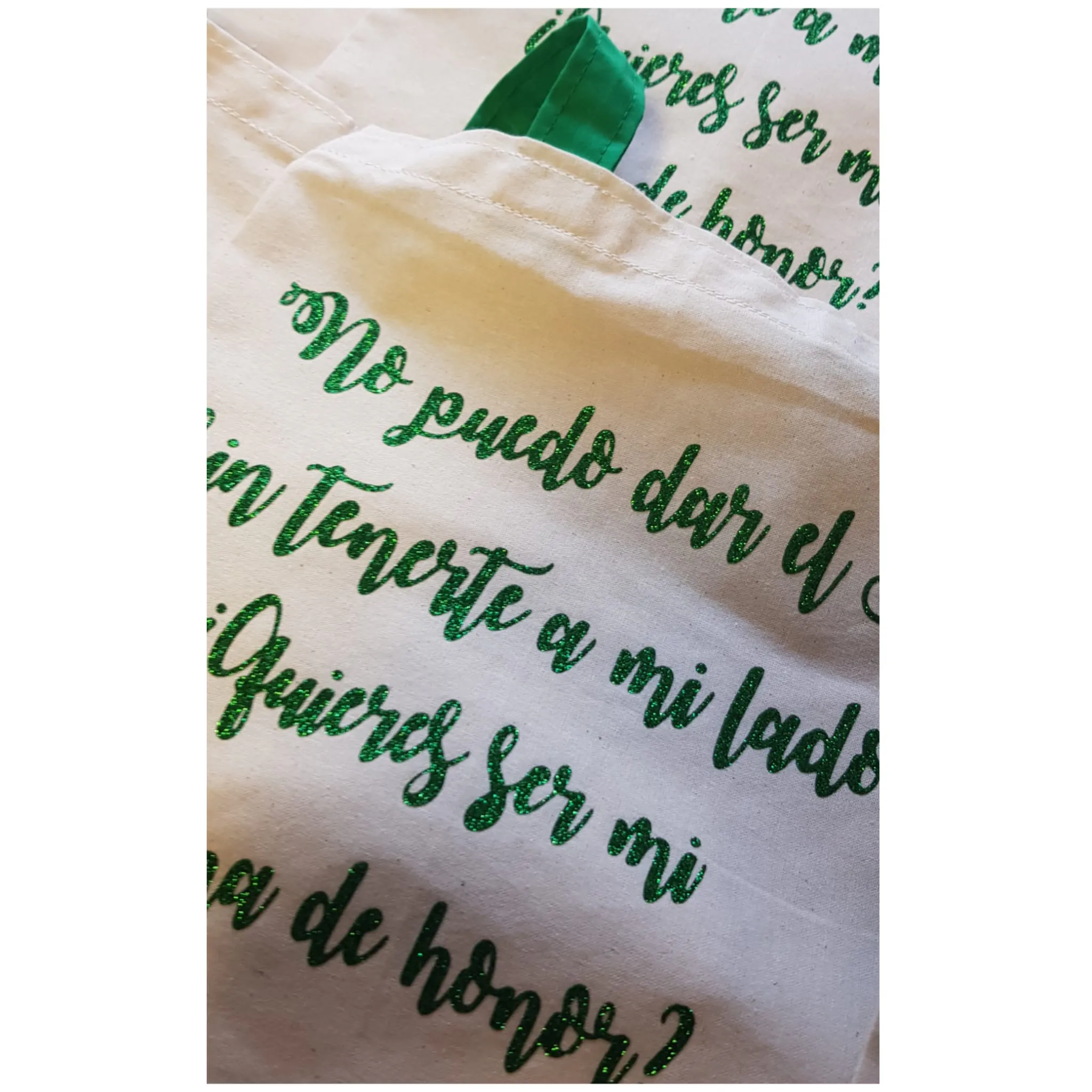 La bolsa se puede personalizar con vinilo, añadiendo nombres, frases o mensajes divertidos, convirtiéndola en un recuerdo único para cada persona. Gracias a su tamaño y asas largas, resulta cómoda de llevar tanto en la boda como en el día a día.
