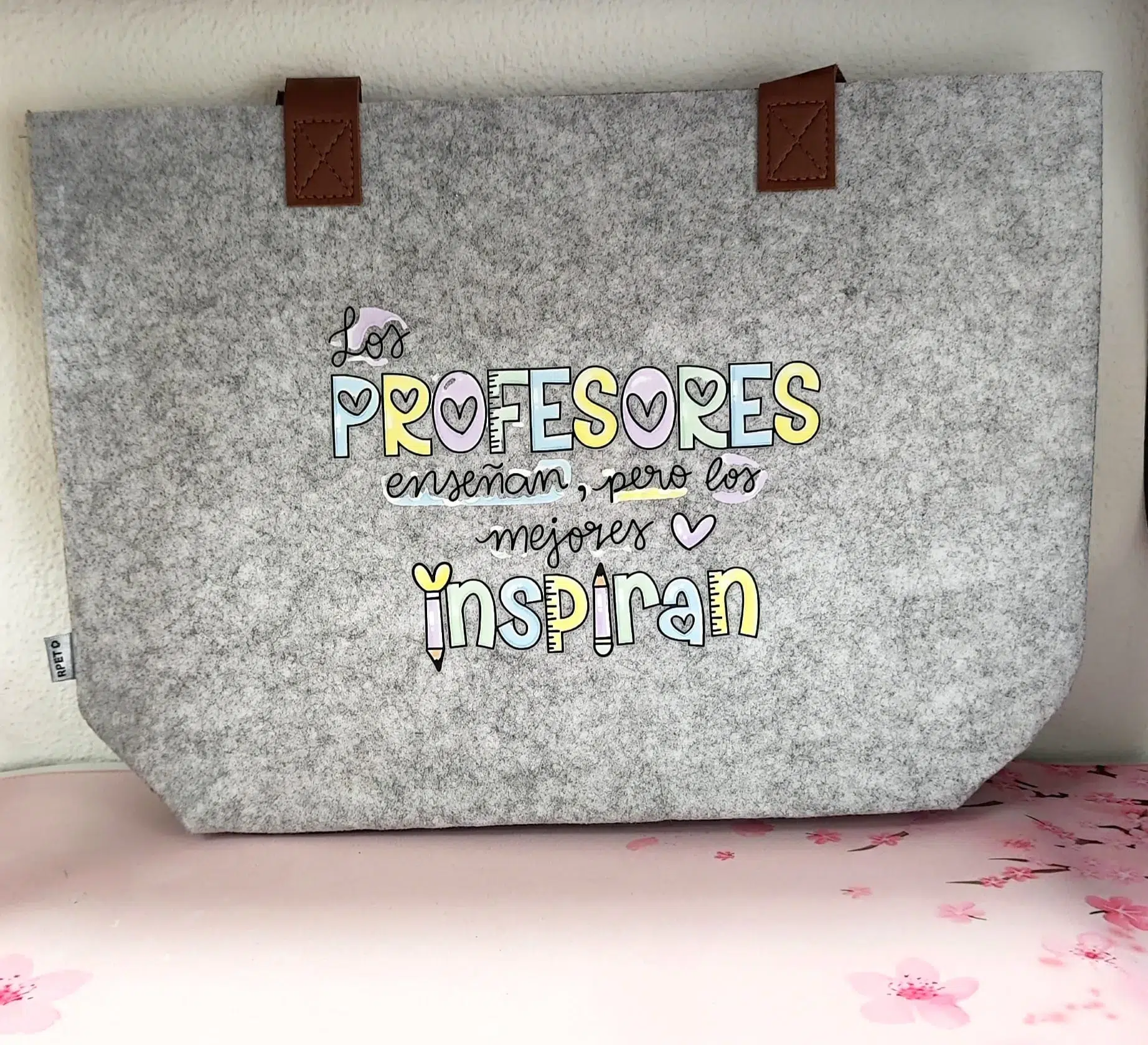 Un homenaje a los PROFESORES que inspiran: este bolso de fieltro gris combina un diseño motivador con la calidad y sostenibilidad del fieltro RPET. Presenta la frase “Los PROFESORES enseñan, pero los mejores INSPIRAN” en un alegre estilo manuscrito y colorido, donde las palabras “PROFESORES” e “INSPIRAN” destacan en tonos pastel y se adornan con pequeños corazones y simpáticos lápices. La impresión del diseño se realiza con técnicas de DTF y vinilo para un acabado vibrante y duradero.