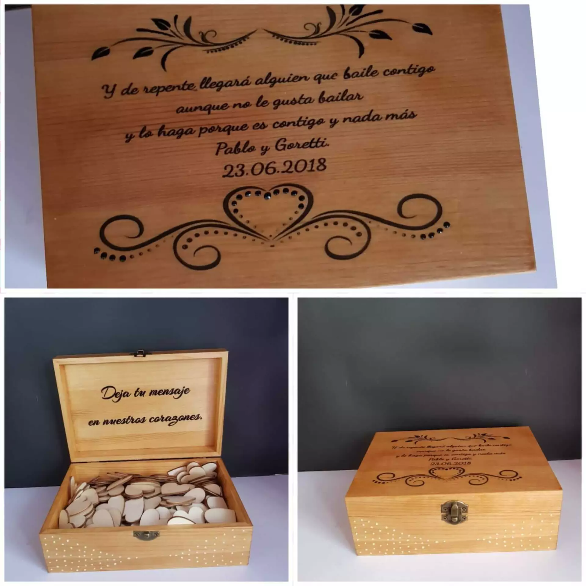 Cajas de madera barnizadas y con transferencia de imagen personalizadas con el texto preferido.
