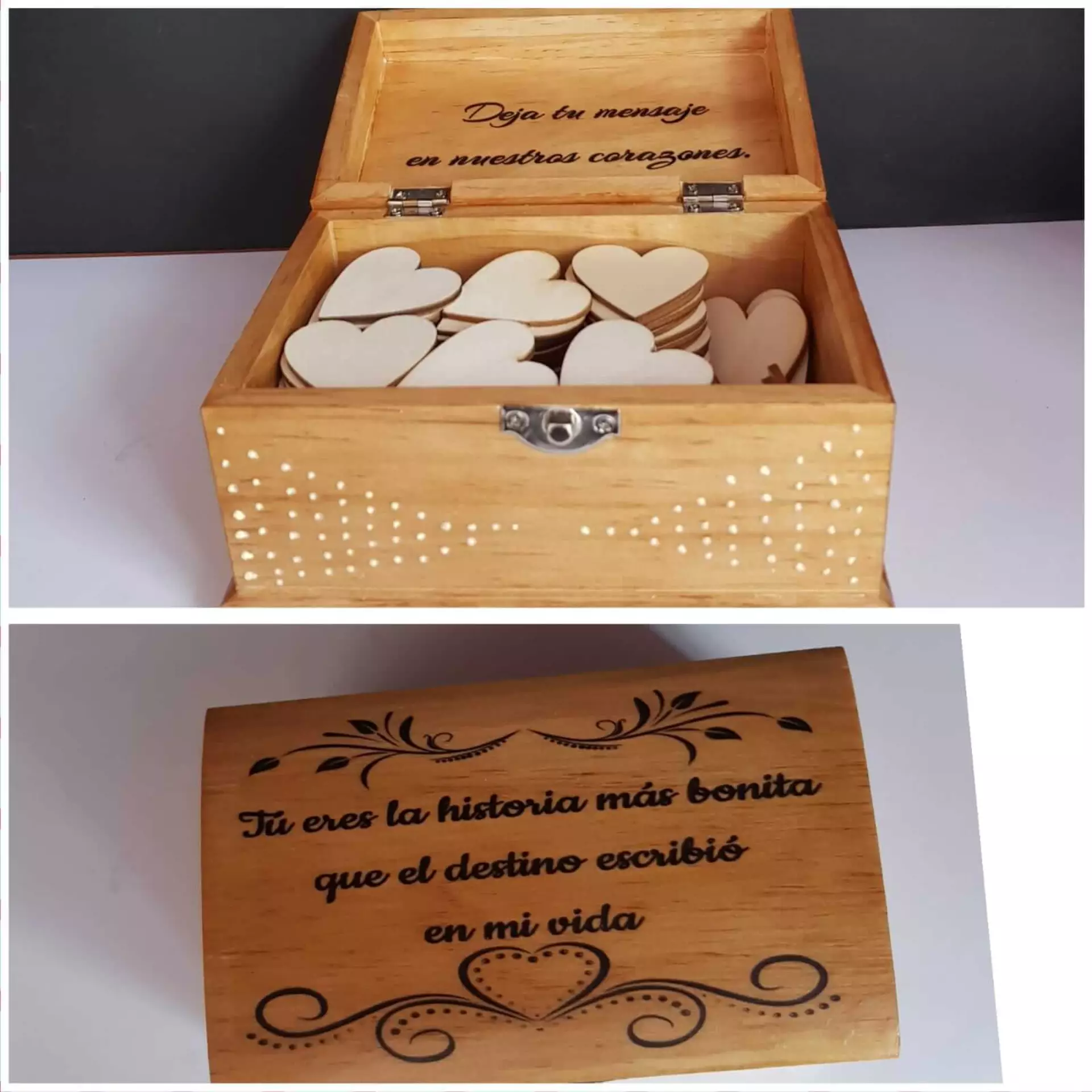 Cajas de madera barnizadas y con transferencia de imagen personalizadas con el texto preferido.
