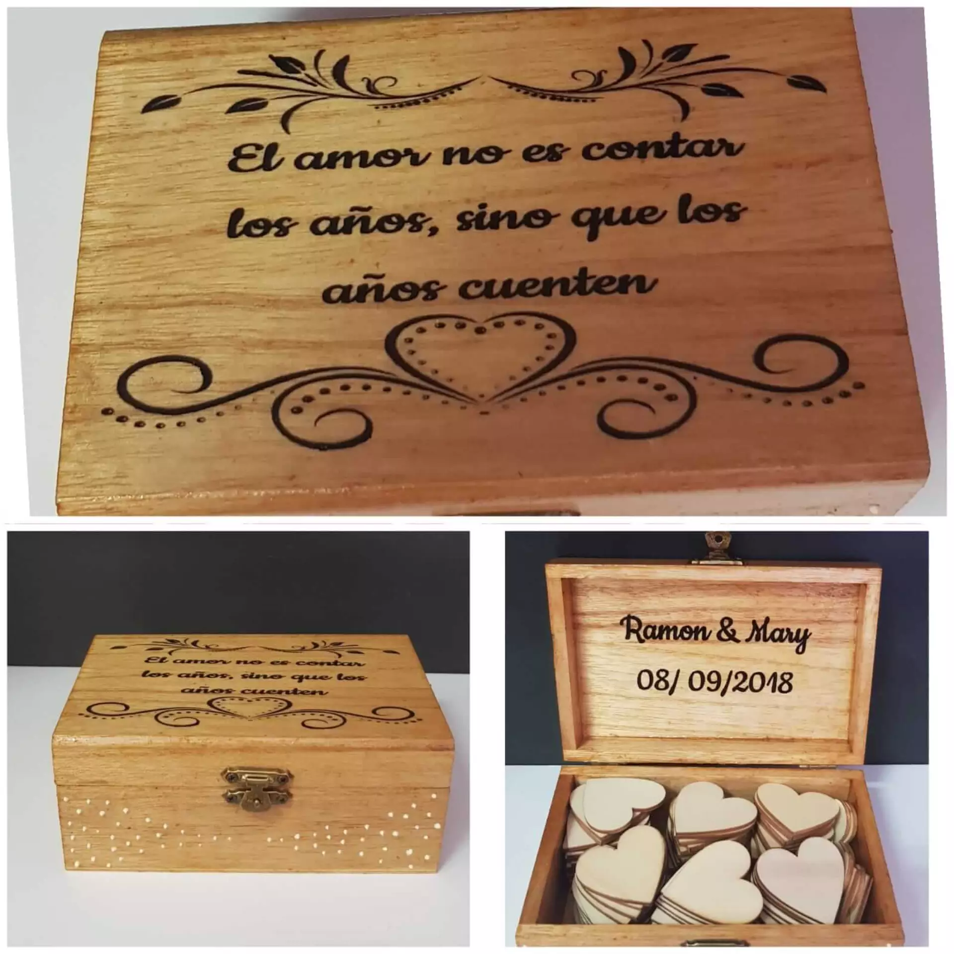 Cajas de madera barnizadas y con transferencia de imagen personalizadas con el texto preferido.