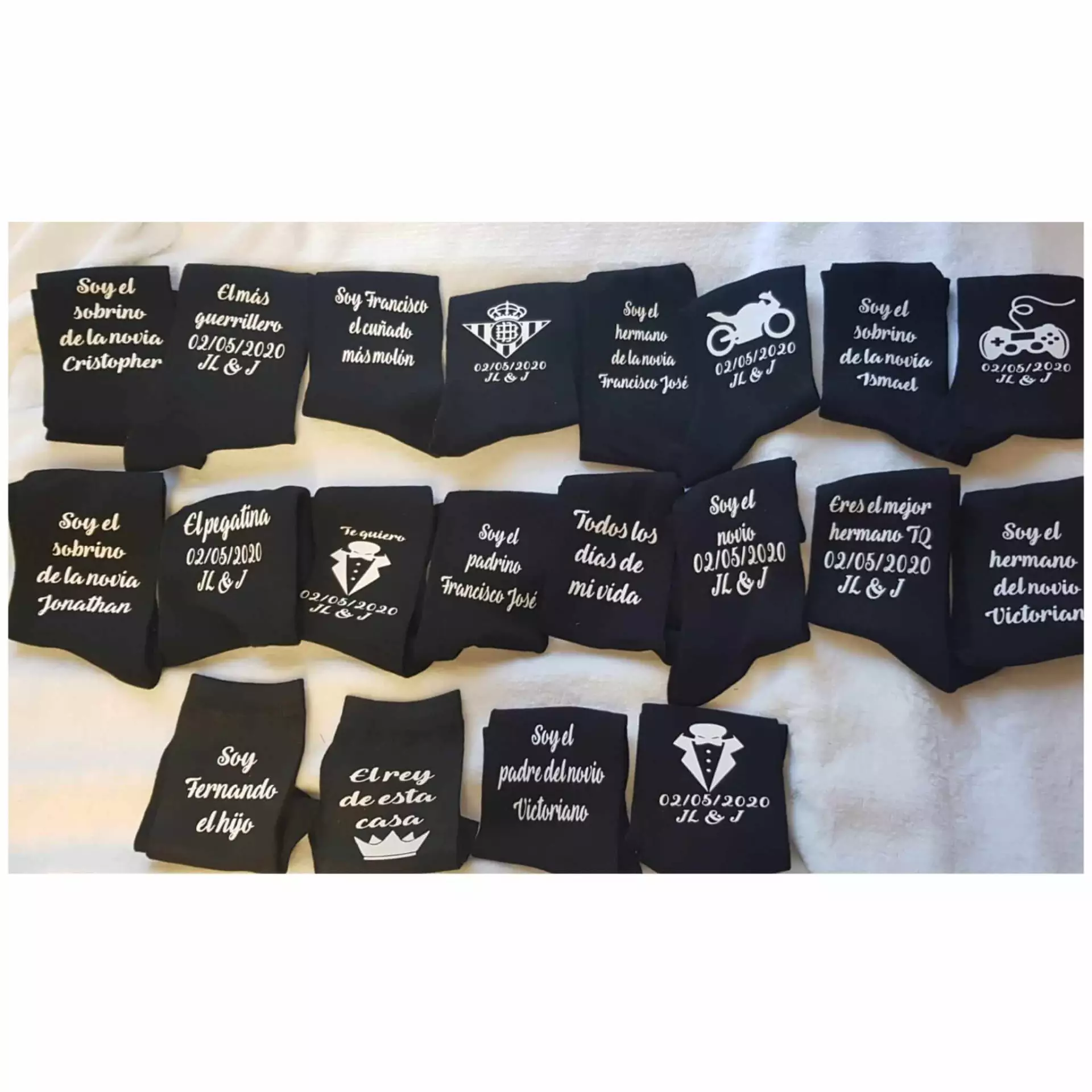 Calcetines personalizados: Si buscas hacer un regalo original y sorprender a tus invitados, elige estos calcetines personalizados con una frase especial o una imagen que represente las aficiones de tus seres queridos, como tu padre, novio, hermano, etc. ¡Ideales para cualquier invitado! Perfectos para conservar recuerdos memorables y obtener fotos únicas en tu boda. No dudes en elegir este detalle único.