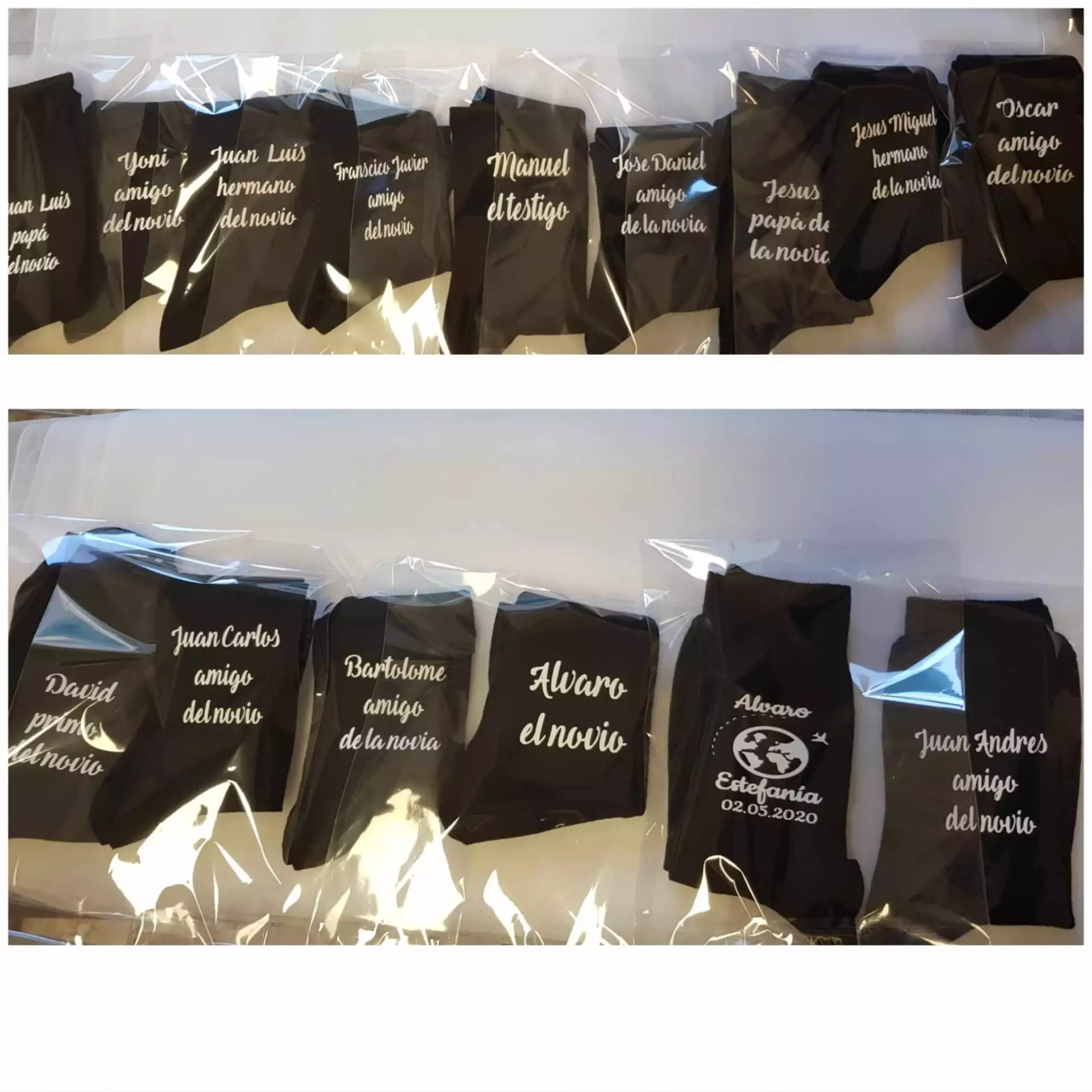 Calcetines personalizados: Si buscas hacer un regalo original y sorprender a tus invitados, elige estos calcetines personalizados con una frase especial o una imagen que represente las aficiones de tus seres queridos, como tu padre, novio, hermano, etc. ¡Ideales para cualquier invitado! Perfectos para conservar recuerdos memorables y obtener fotos únicas en tu boda. No dudes en elegir este detalle único.