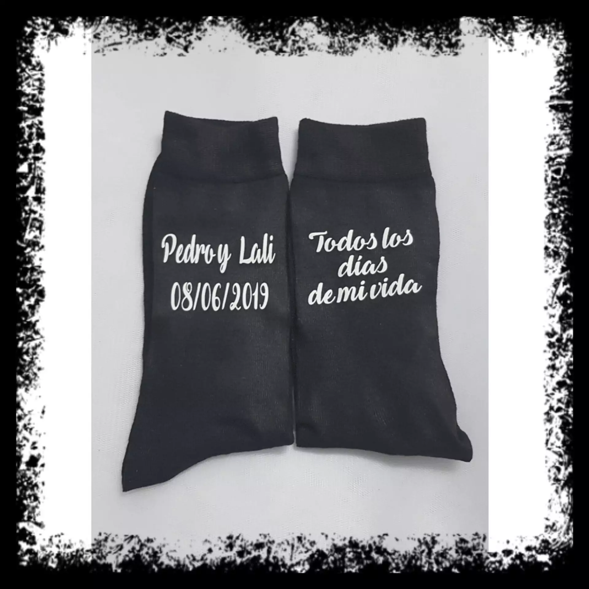 Calcetines personalizados: Si buscas hacer un regalo original y sorprender a tus invitados, elige estos calcetines personalizados con una frase especial o una imagen que represente las aficiones de tus seres queridos, como tu padre, novio, hermano, etc. ¡Ideales para cualquier invitado! Perfectos para conservar recuerdos memorables y obtener fotos únicas en tu boda. No dudes en elegir este detalle único.