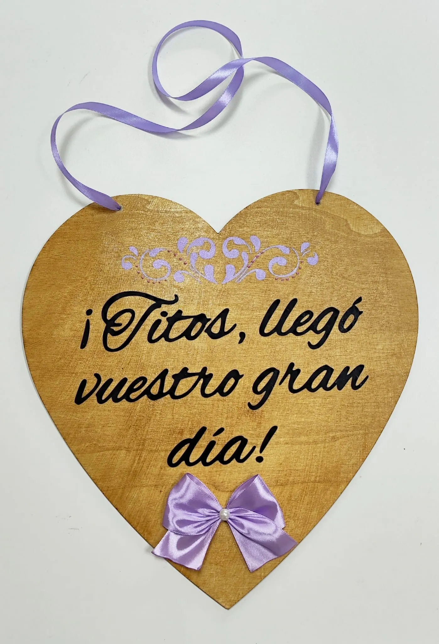 Cartel en forma de corazón fabricado en madera barnizada, con cinta de raso lila para colgar y lazo decorativo a juego.