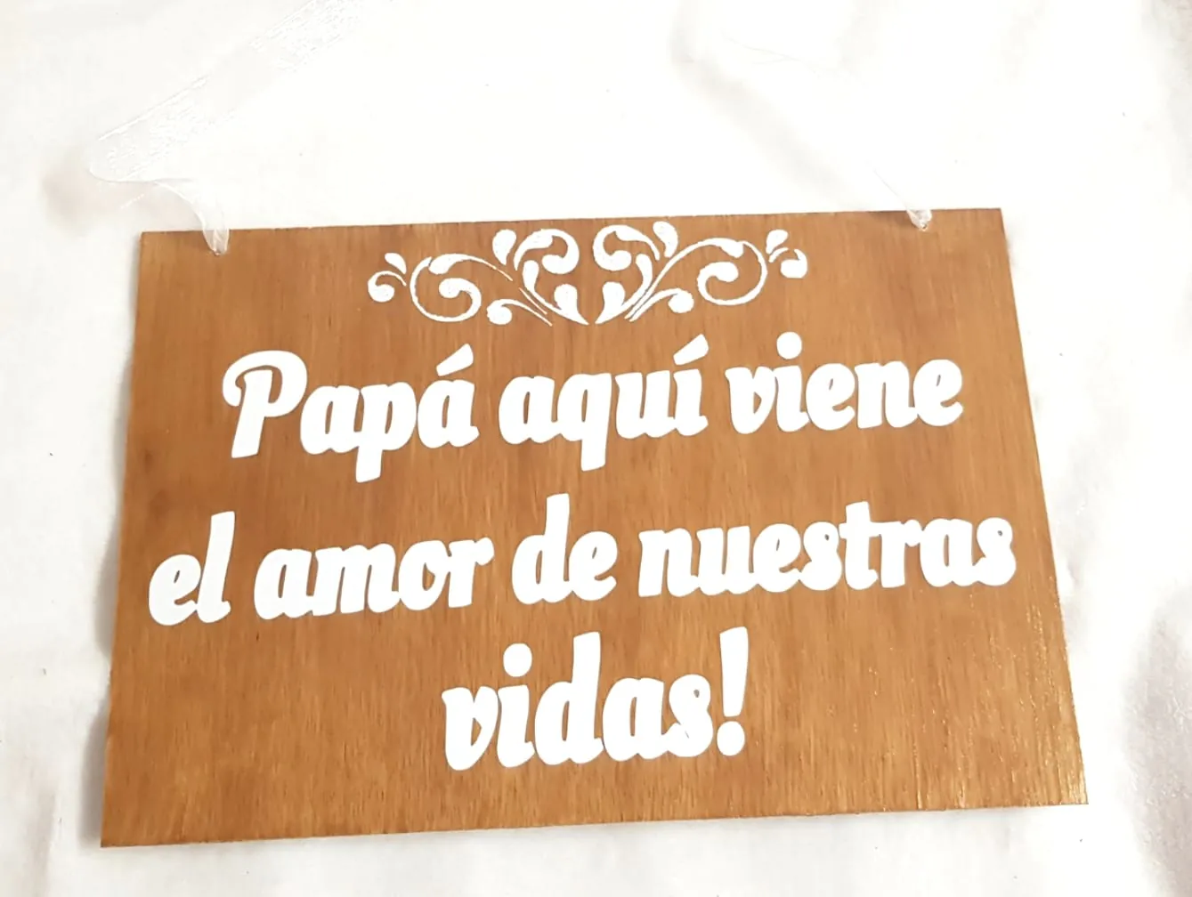 Cartel de madera rectangular diseñado para momentos especiales en bodas, con la frase “Papá aquí viene el amor de nuestras vidas” en vinilo blanco. Un detalle emotivo que dará un toque único a la entrada y quedará perfecto en las fotos.
