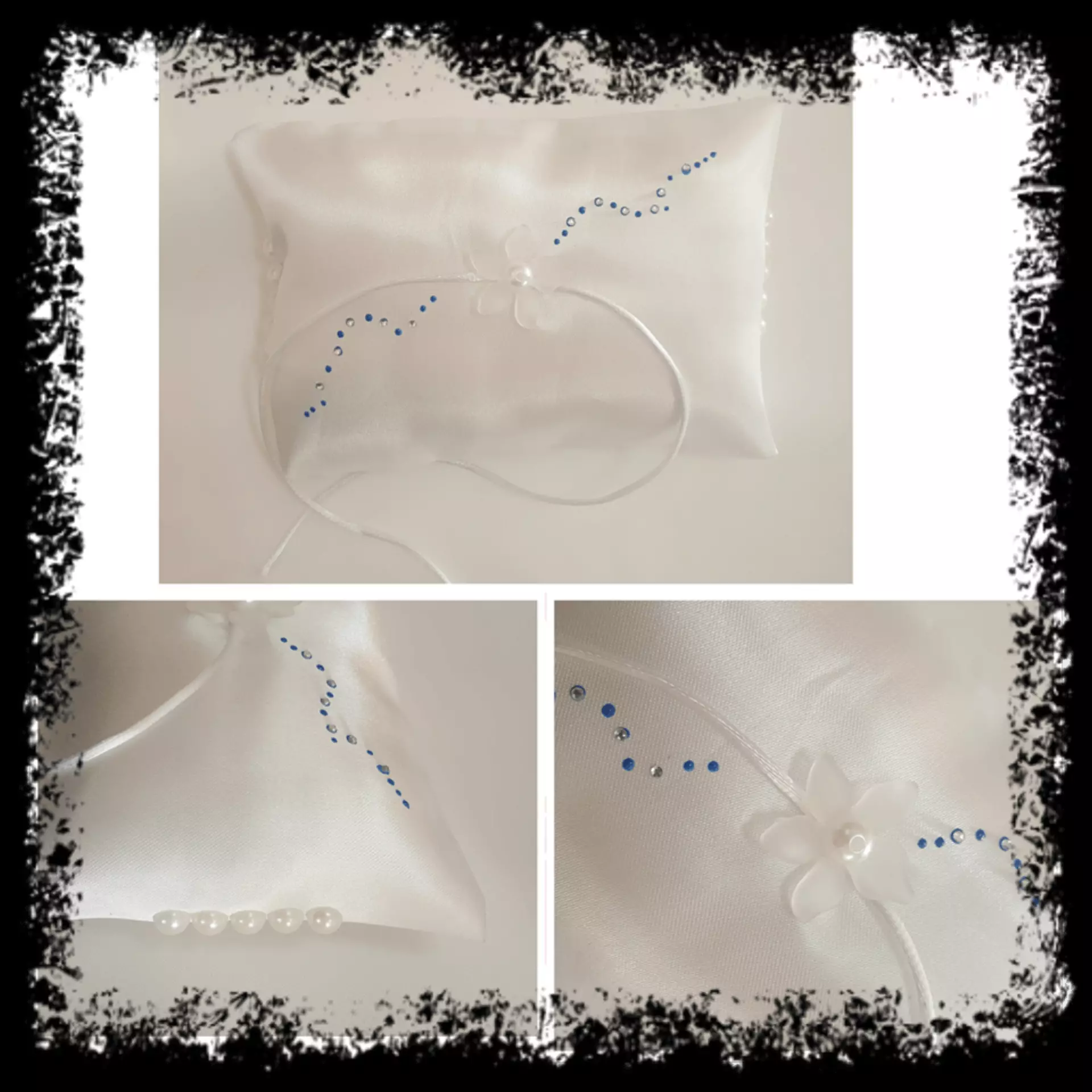 El cojín porta alianzas es un elemento imprescindible en la ceremonia de boda. Este modelo combina la elegancia del satén blanco con detalles en azul, siguiendo la tradición de llevar “algo azul” el día de la boda para atraer la buena suerte.