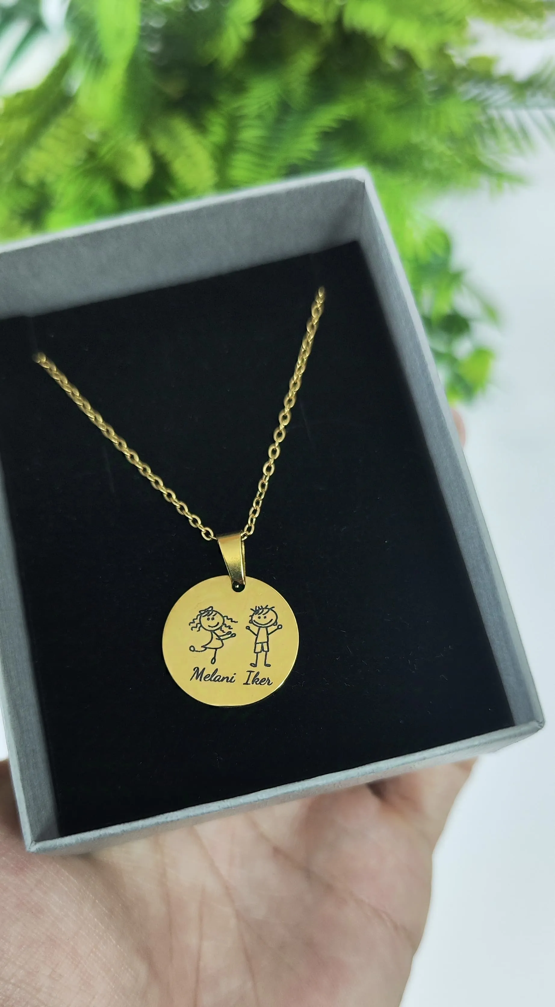 Este collar es el detalle perfecto para madres y abuelas que desean llevar siempre consigo a sus seres queridos. Su colgante redondo de acero inoxidable se graba con figuras de niños y los nombres personalizados, creando un diseño emotivo y lleno de significado.