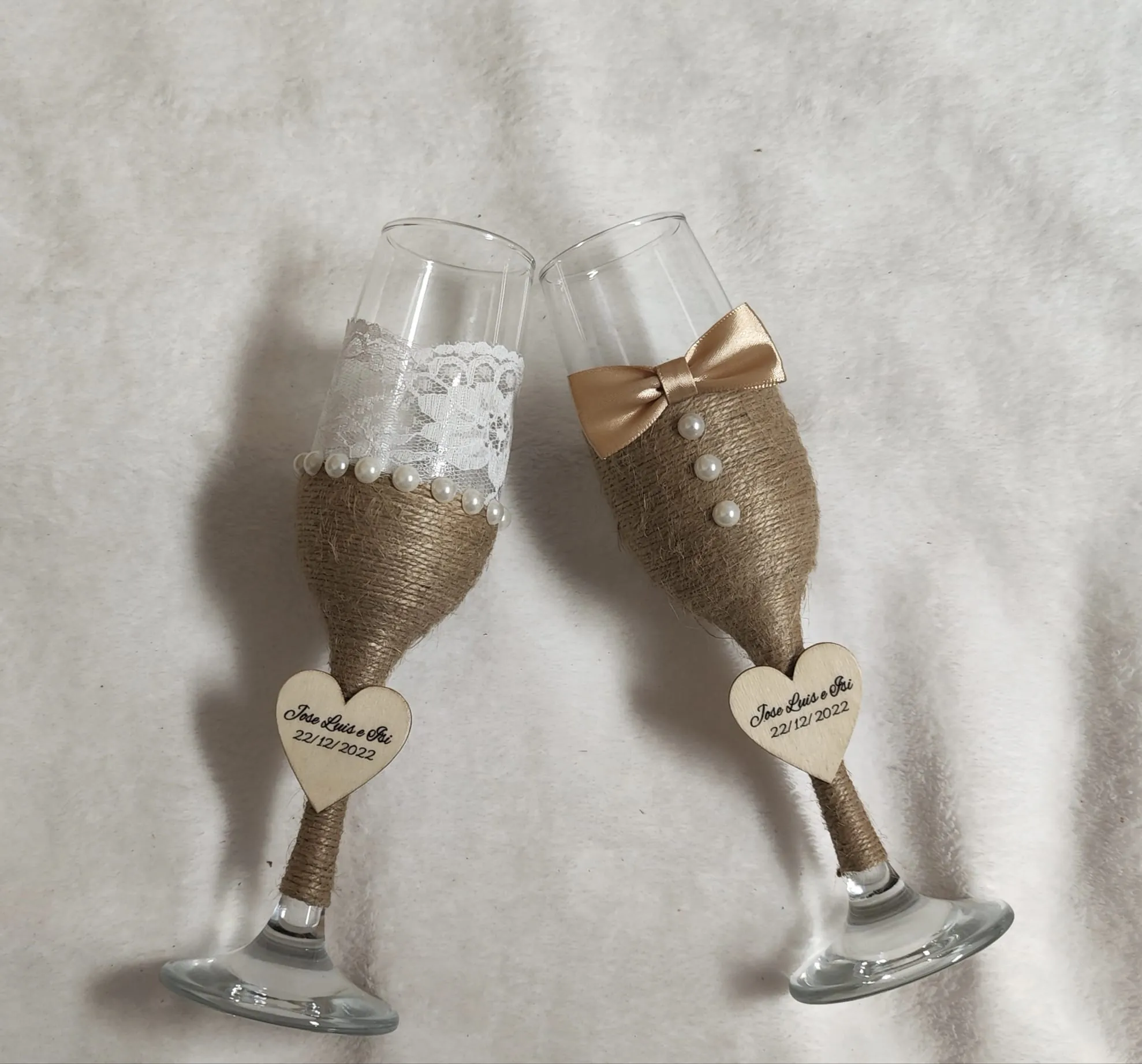 Estas copas de cava combinan cristal transparente con detalles rústicos naturales. Cada copa está decorada con yute enrollado, encaje delicado, perlas blancas y un lazo dorado que le da un toque elegante.