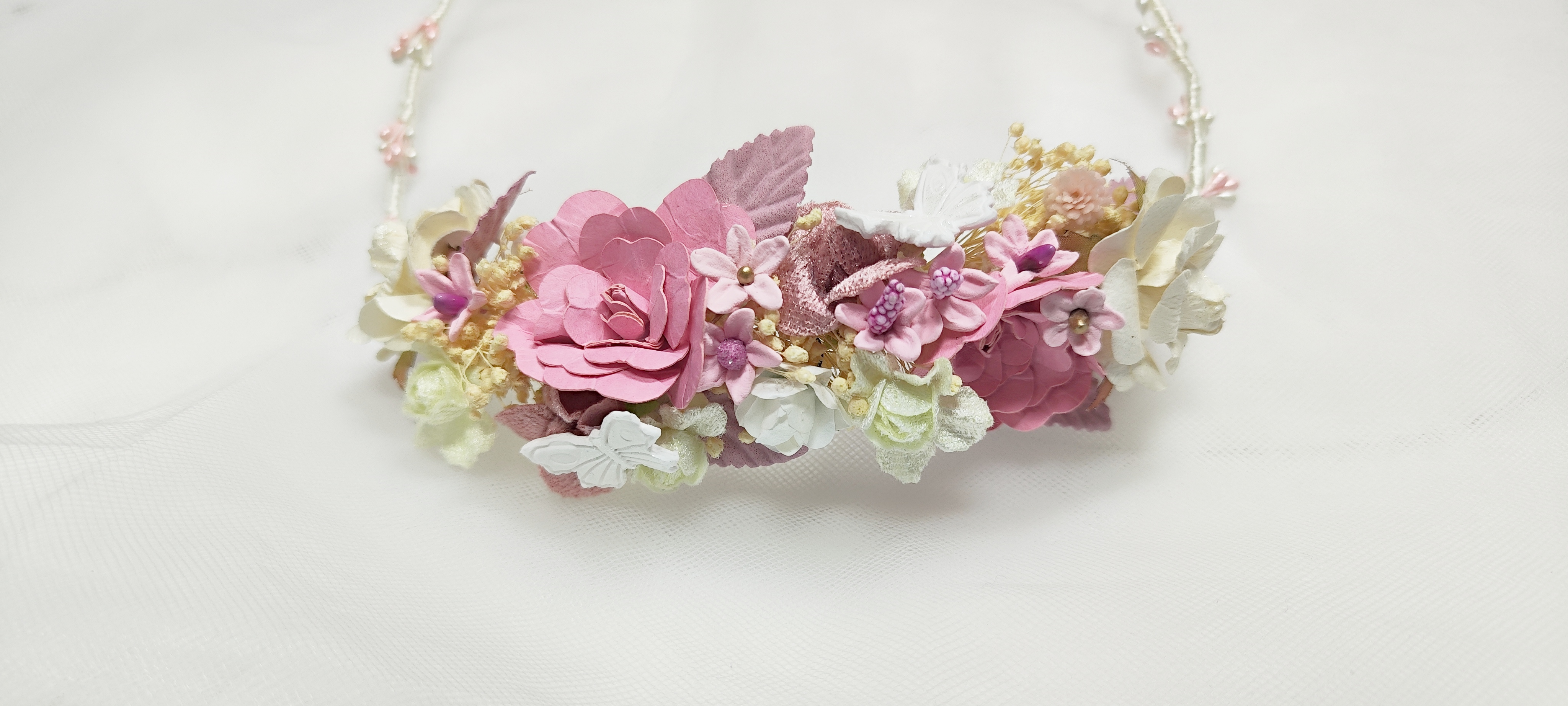 Nuestra Corona de Flores para Primera Comunión es la elección ideal para dar un toque final de gracia y belleza al atuendo de la niña en su día especial. Diseñada con un conjunto de flores naturales y delicadas, esta corona aporta un estilo fresco y elegante. Es cómoda de llevar y se adapta fácilmente a diferentes peinados. Ofrecemos la opción de personalizarla para que coincida perfectamente con el vestido y los gustos de la niña.