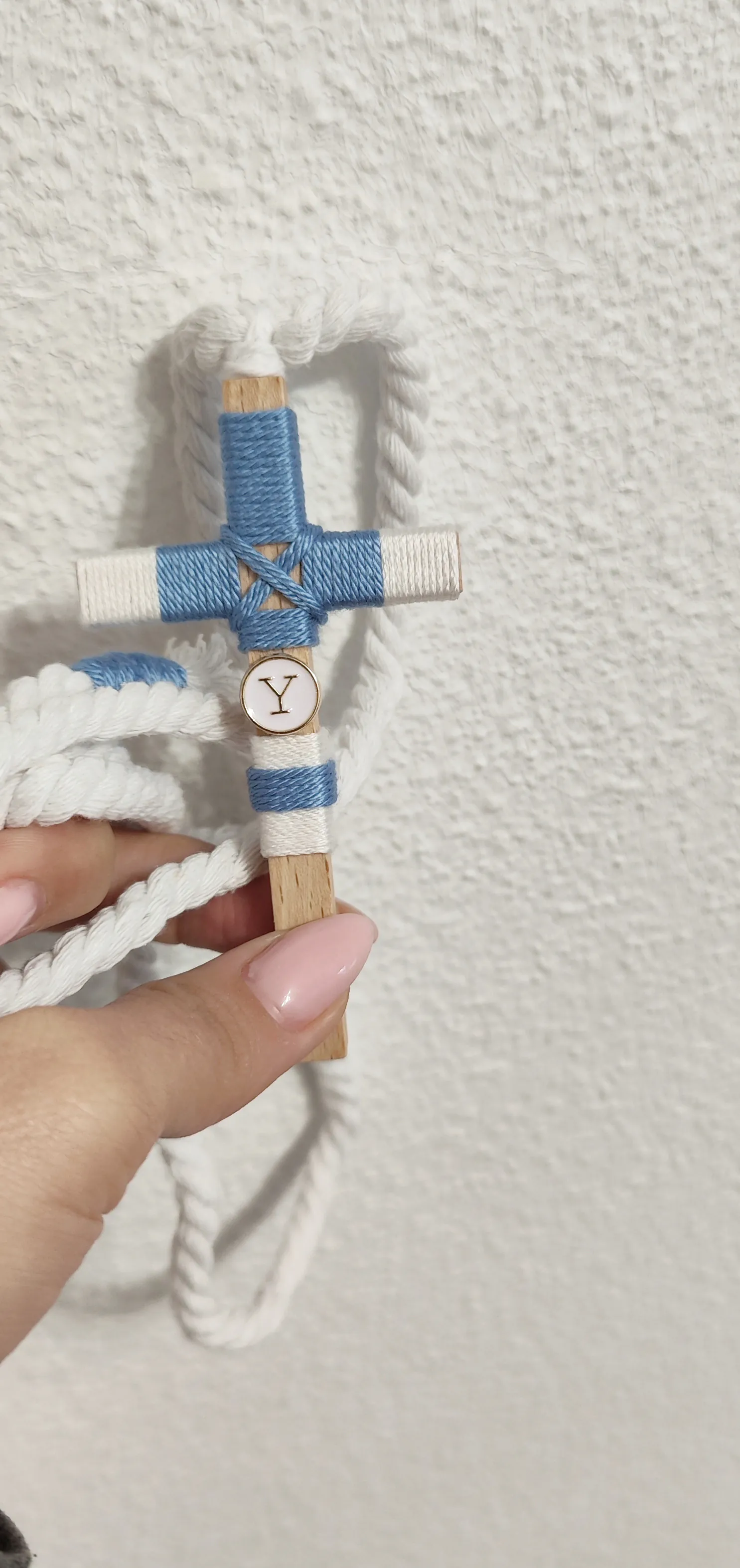 Cruz de comunión en madera para niño, decorada con hilo azul celeste y blanco, con cruce en el centro.