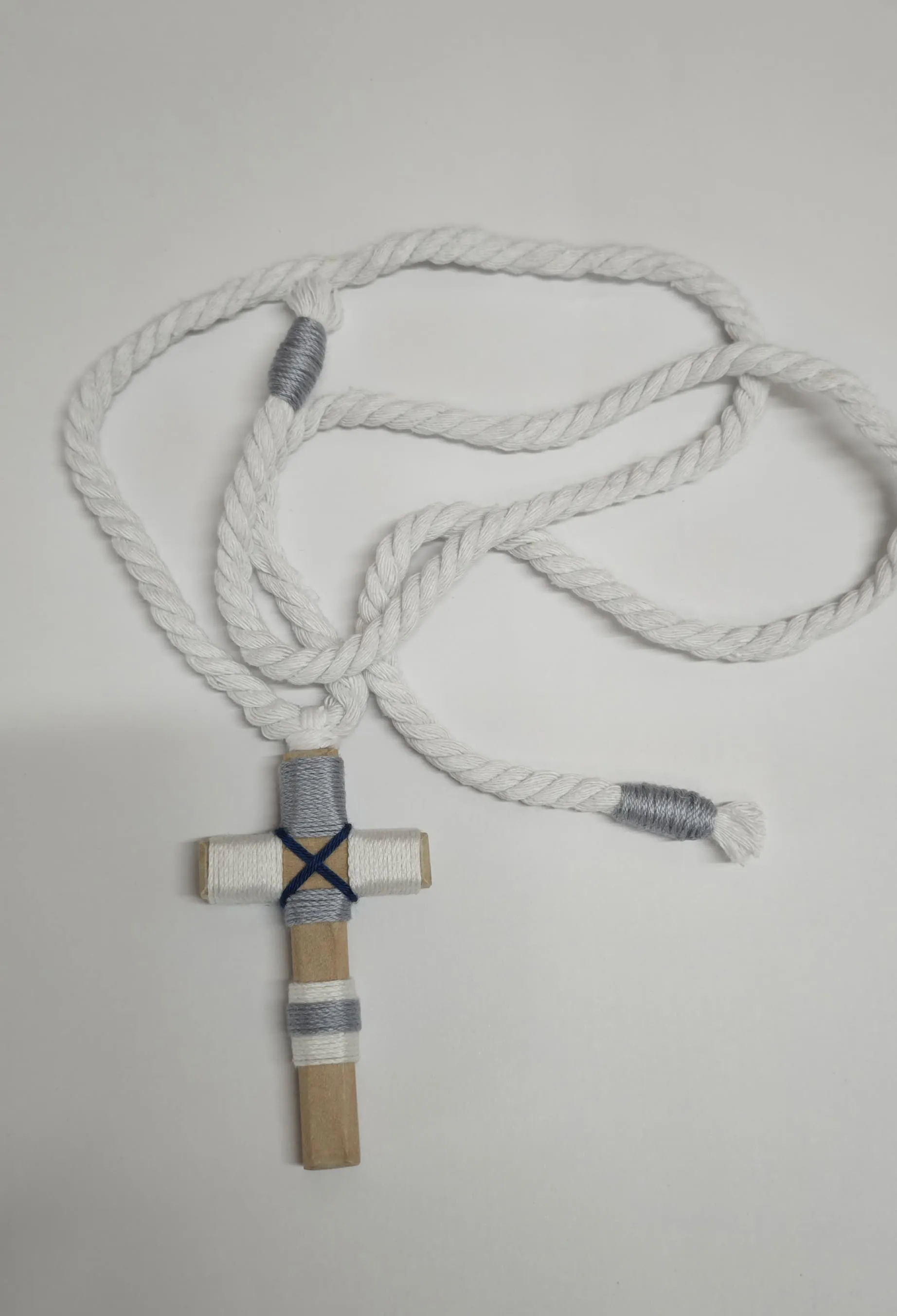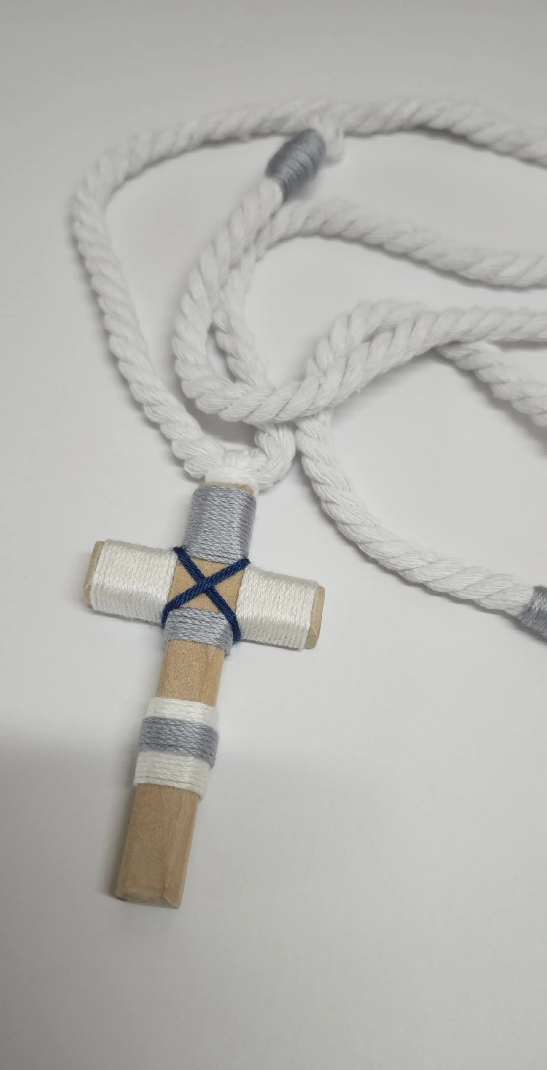 Cruz de comunión en madera para niño gris y azul, decorada con hilo gris, azul marino y blanco con cordón trenzado blanco.