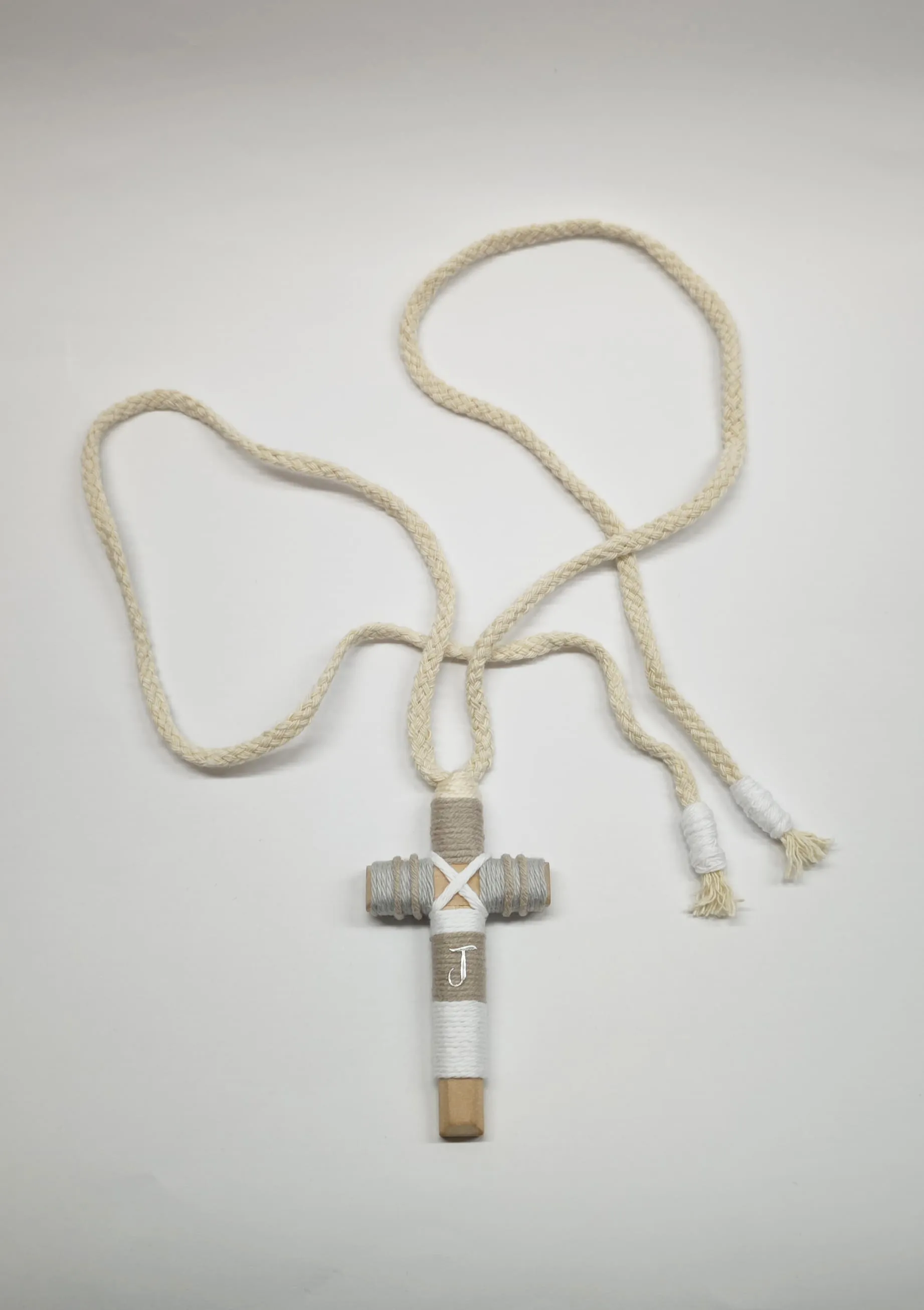 Cruz de comunión en madera para niño gris, blanco y beige, decorada con hilo gris, blanco y beige con cordón trenzado a juego.