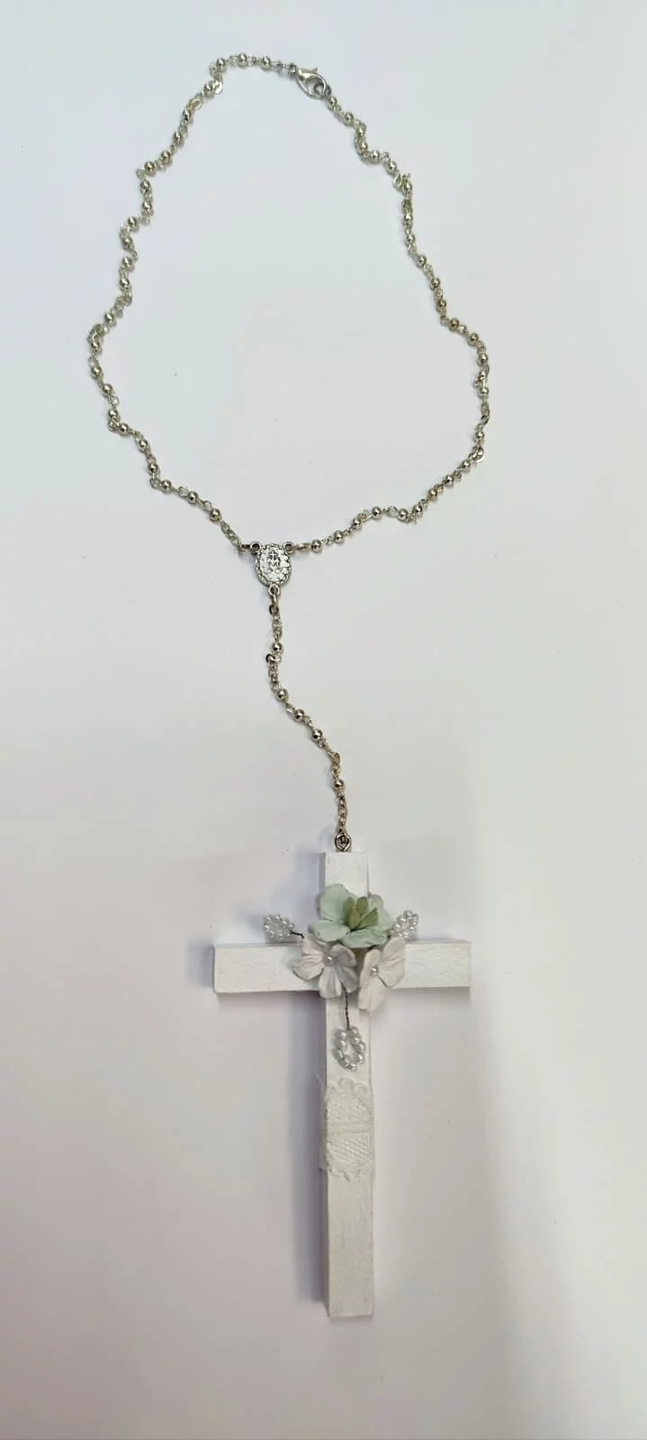 Cruz de comunión en madera de color blanco, decorada con flores en los tonos verde menta, blanco , combinada con detalles plateados que aparecen en la foto.