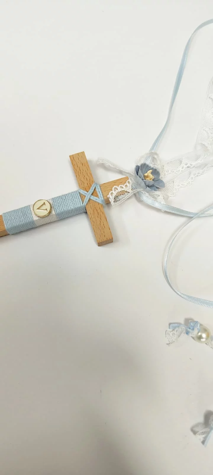 Cruz de comunión en madera natural , decorada con hilo celeste enrollado en forma de X, flor azul y encaje blanco, tal como aparecen en la foto.