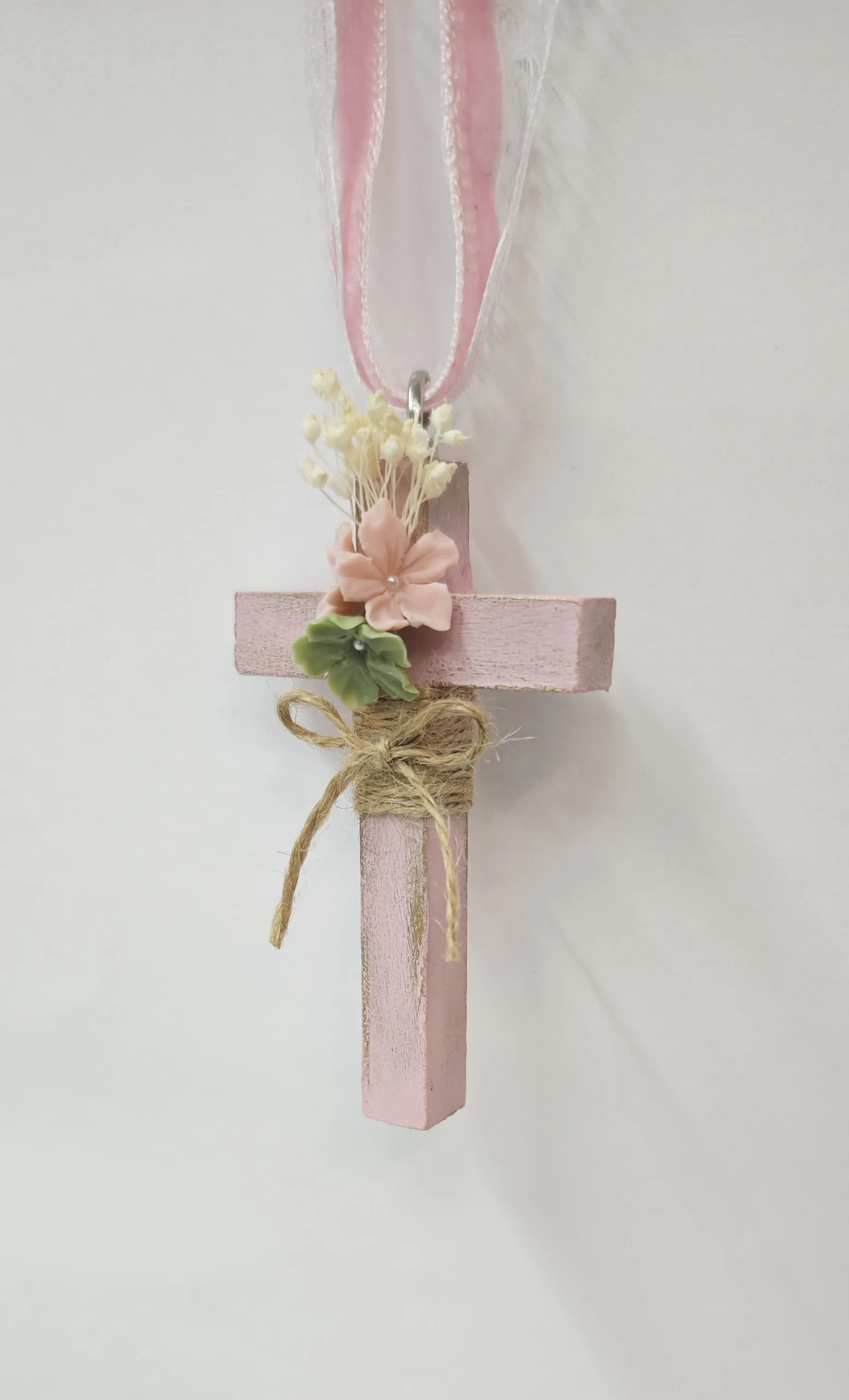 Cruz de comunión en madera para niña con acabado envejecido en rosa y oro, decorada con flores en tonos pastel y un lazo de yute.