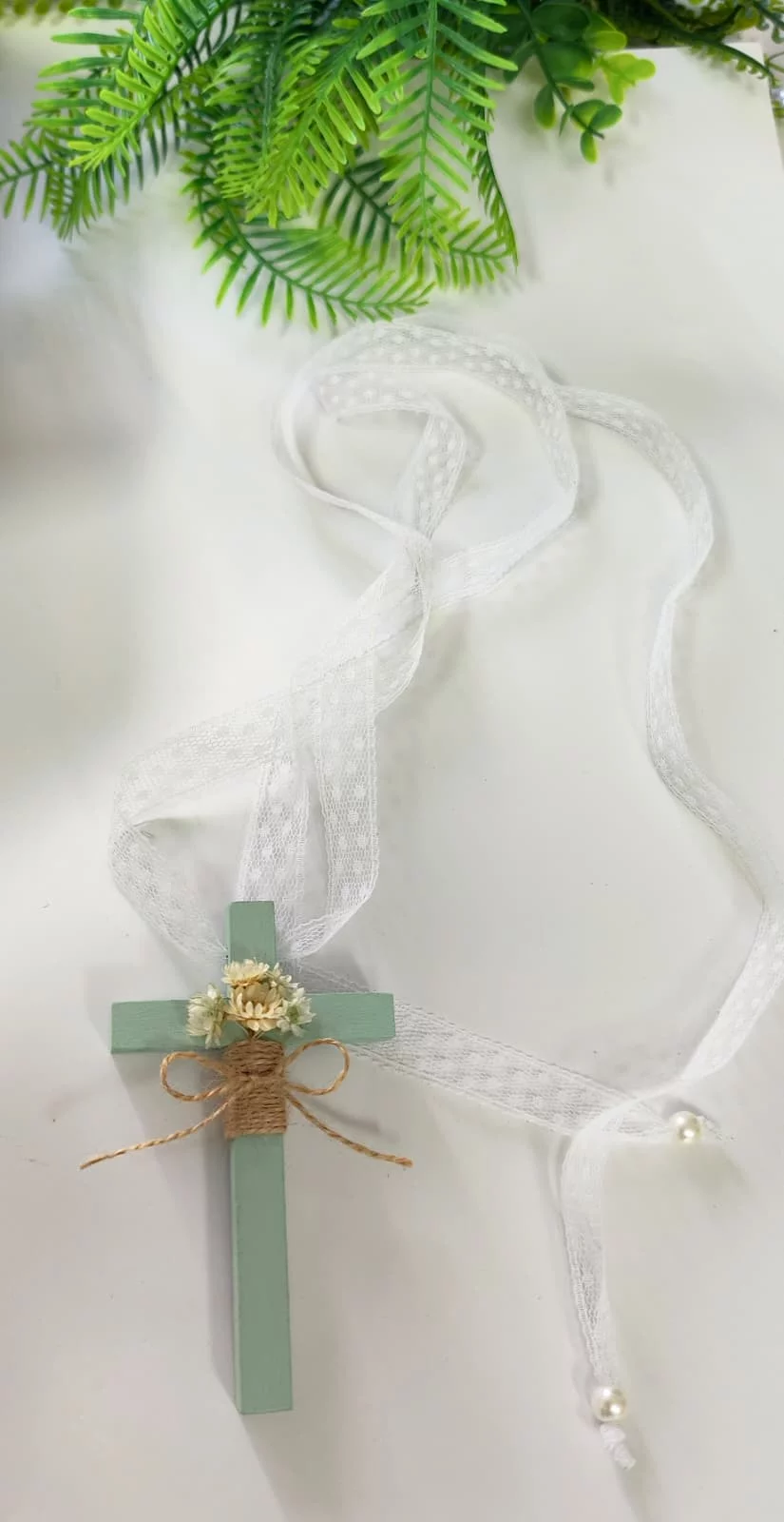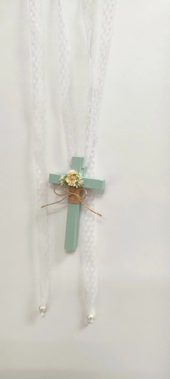 Cruz de comunión en madera de color verde menta, decorada con encaje blanco, lazo de yute natural y flores verde menta/crema, tal como aparecen en la foto.