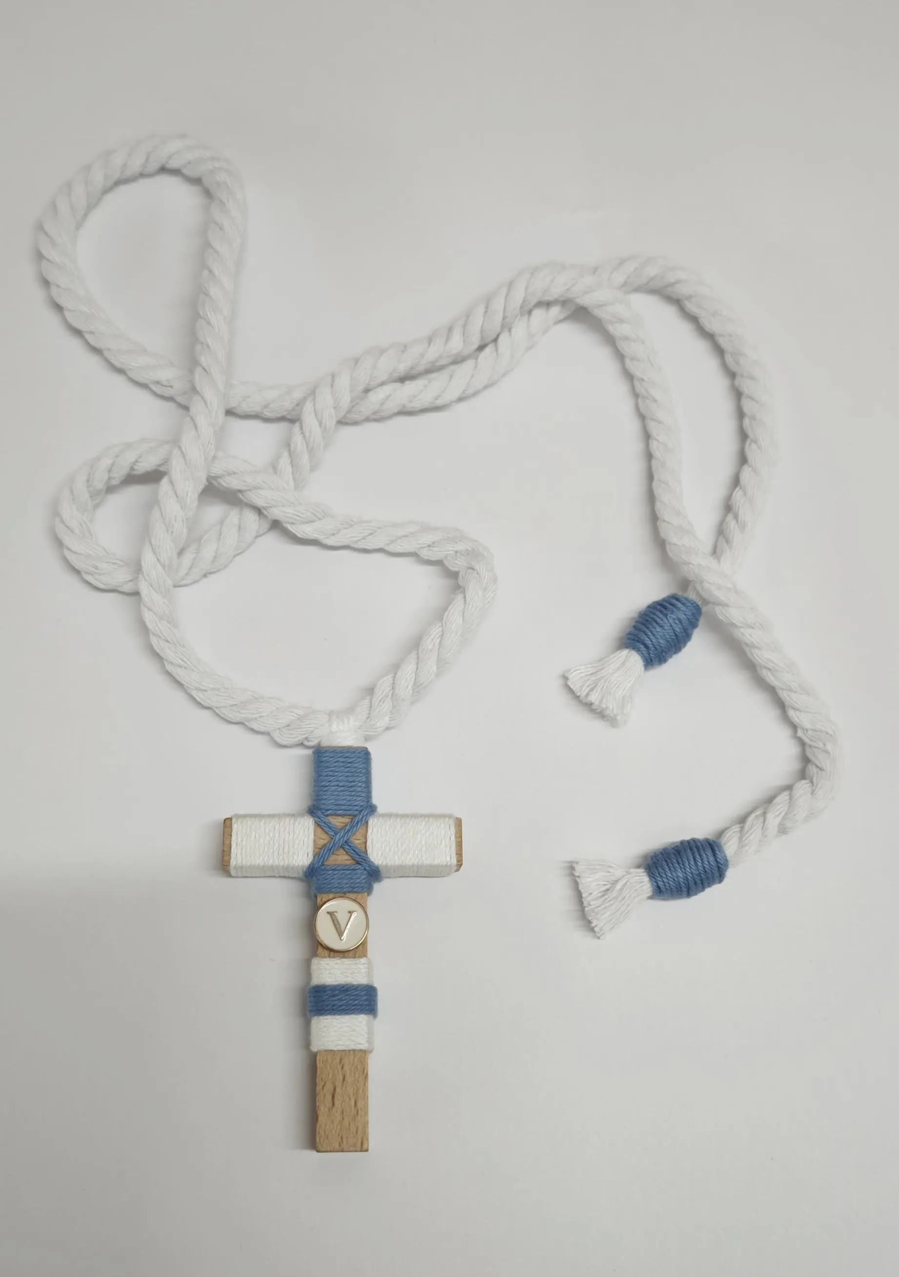 Cruz de comunión en madera para niño, decorada con hilo azul y blanco con remates a juego en el cordón.