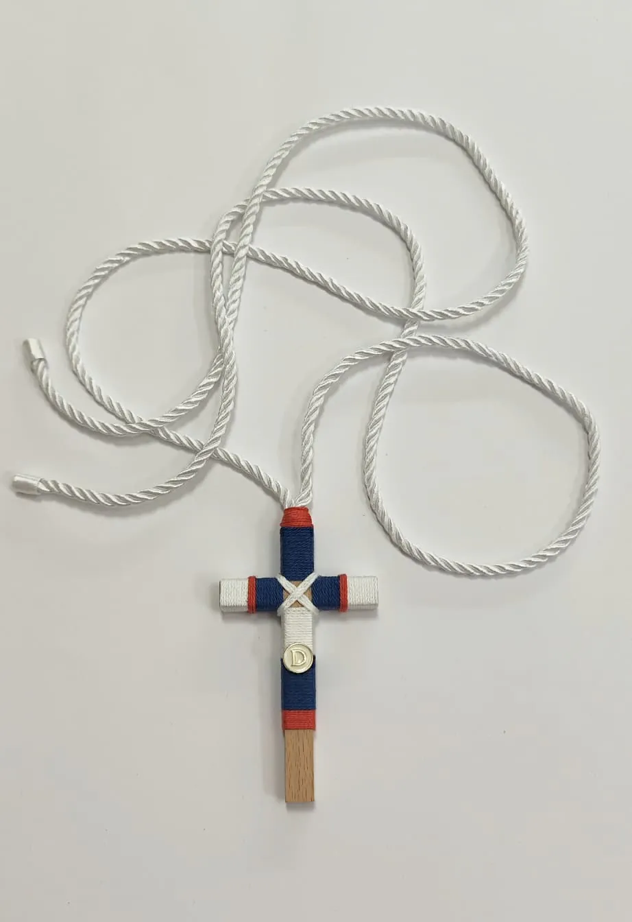 Cruz de comunión en madera, decorada con hilo en los colores que corresponden, combinada con los detalles que aparecen en la foto (cordón, adornos).