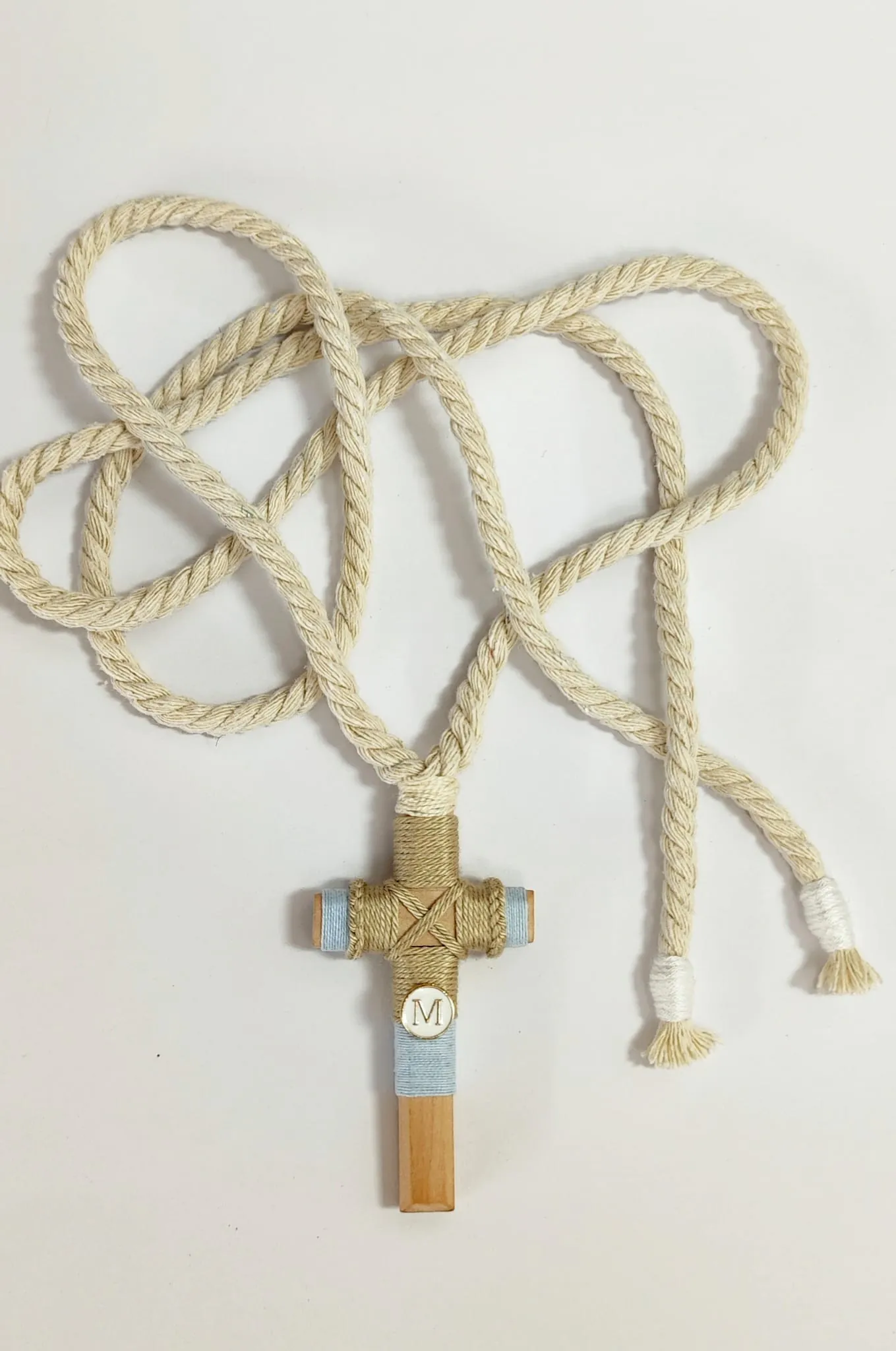 Cruz de comunión en madera, decorada con hilo en los colores que corresponden, combinada con los detalles que aparecen en la foto (cordón, cintas, encaje, adornos).