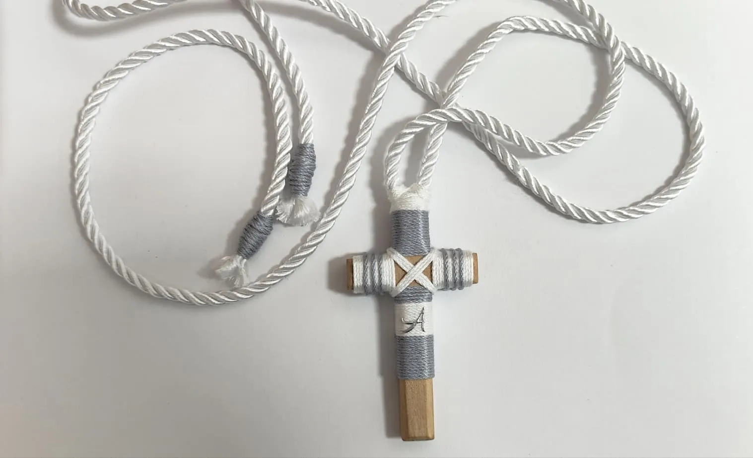 Cruz de comunión en madera, decorada con hilo en los colores que corresponden, combinada con los detalles que aparecen en la foto (cordón, cintas, encaje, adornos).