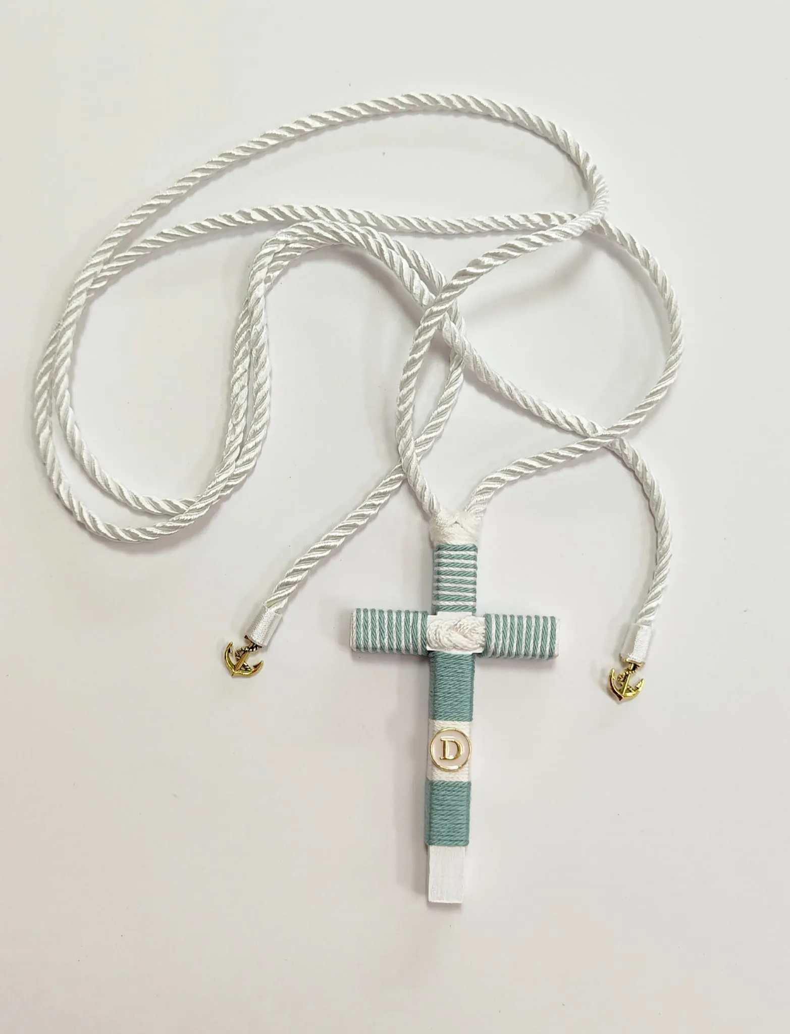 Cruz de comunión en madera, decorada con hilo en los colores que corresponden, combinada con los detalles que aparecen en la foto (cordón, adornos).