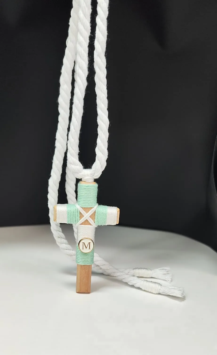Cruz de comunión en madera, decorada con hilo en los colores que corresponden, combinada con los detalles que aparecen en la foto (cordón, cintas, encaje, adornos).