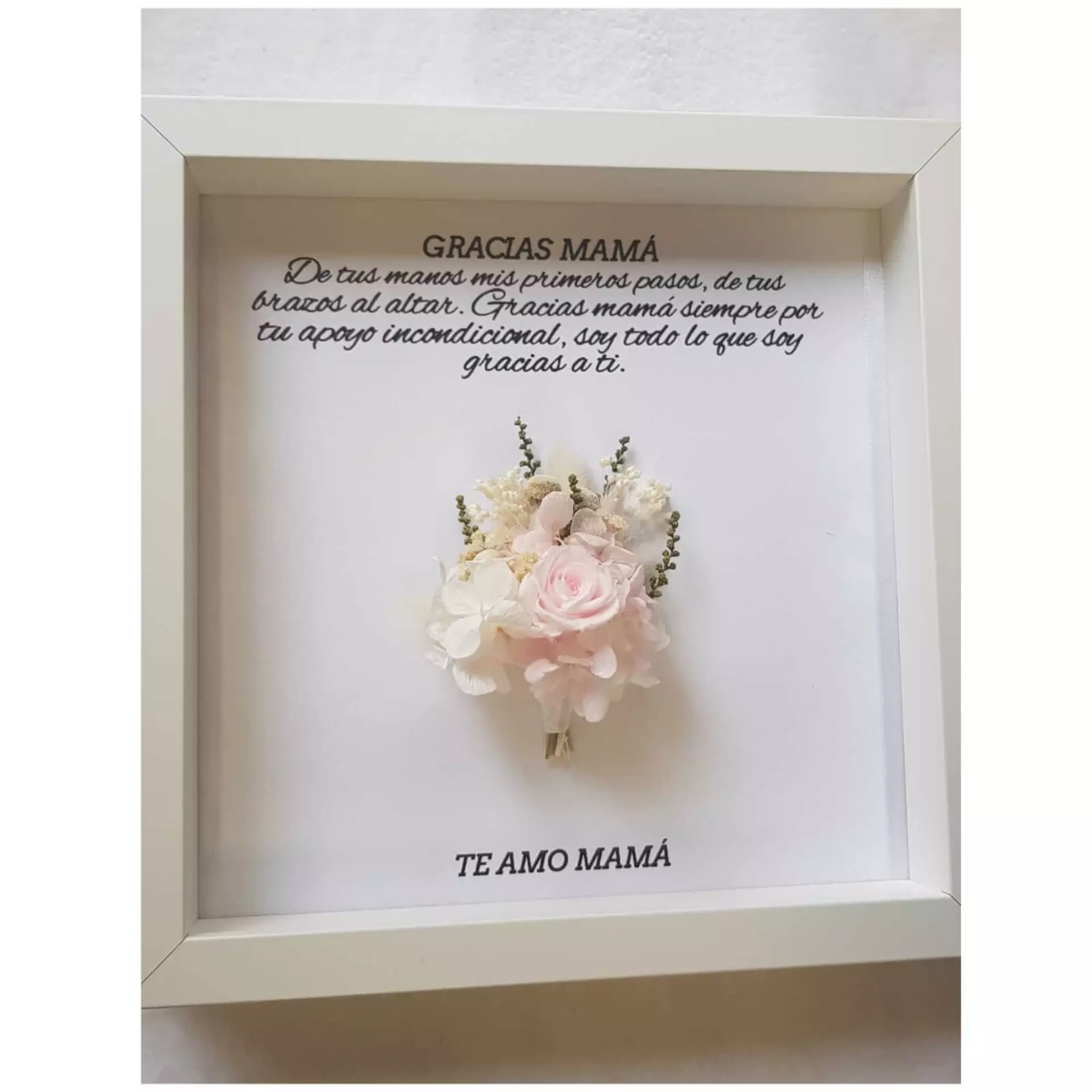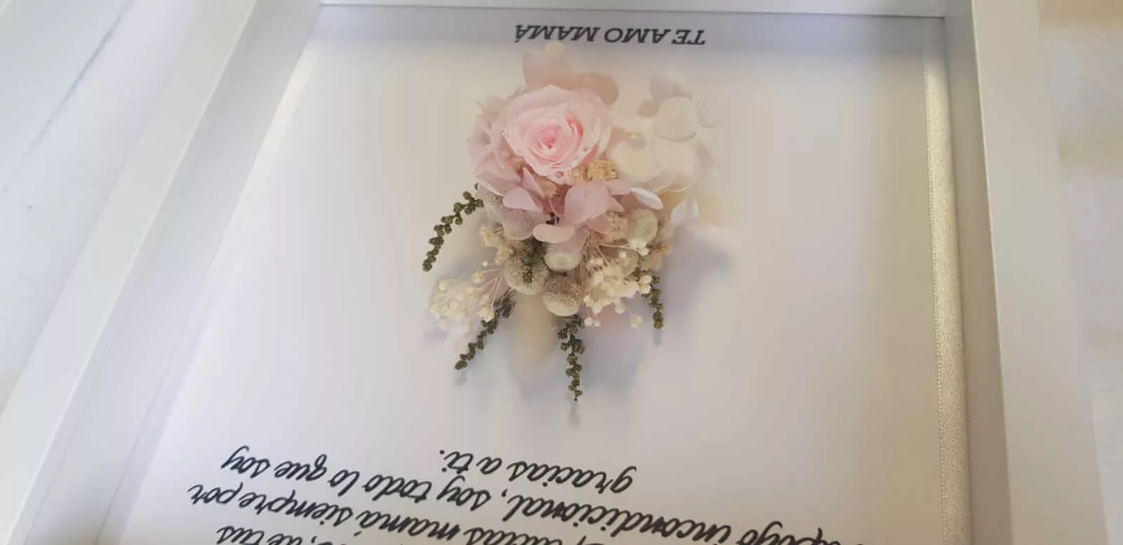 - Cuadro personalizado realizado con flores preservadas y frase emotiva para la persona importante de tu vida.