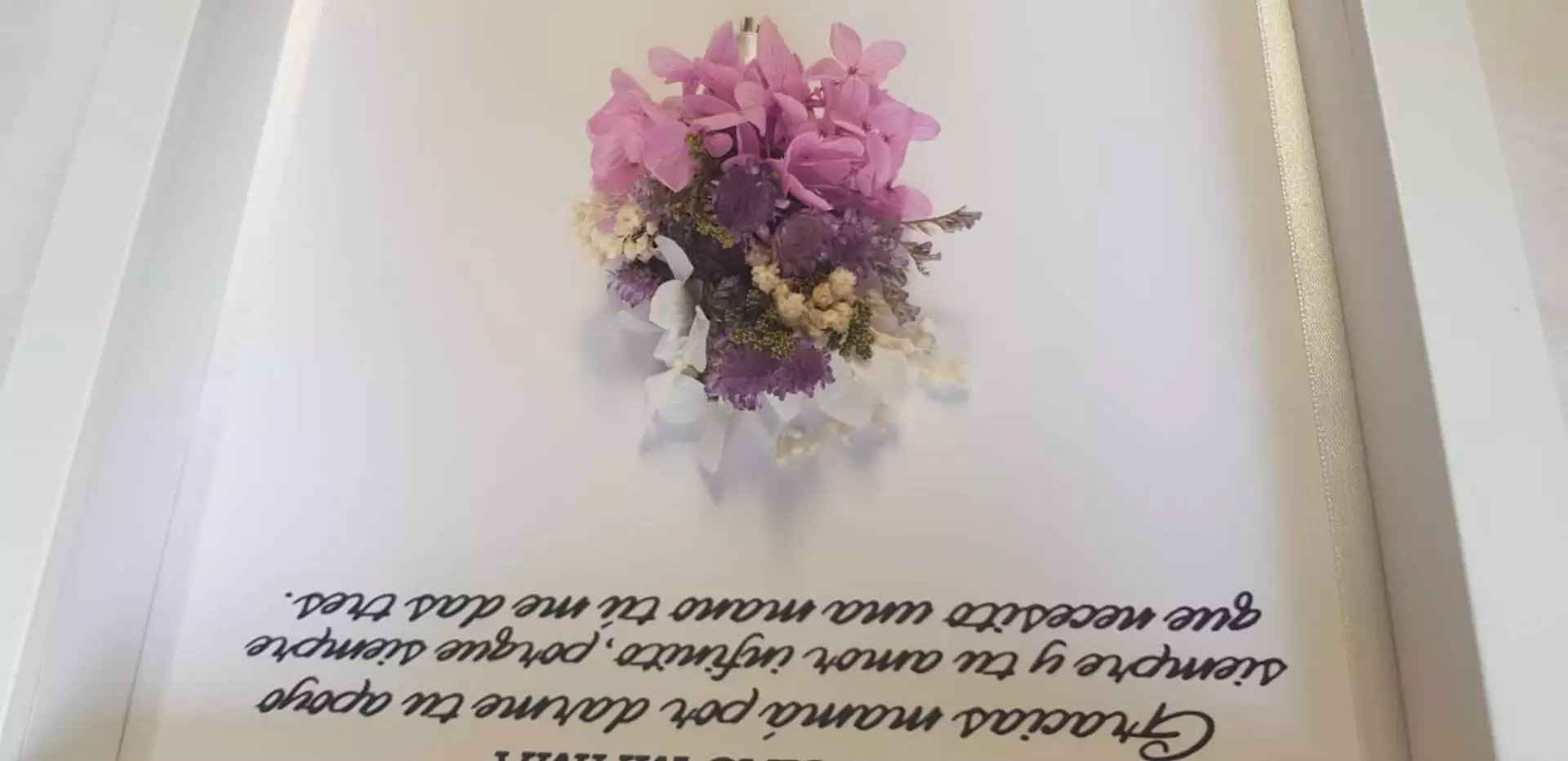 - Cuadro personalizado realizado con flores preservadas y frase emotiva para la persona importante de tu vida.
