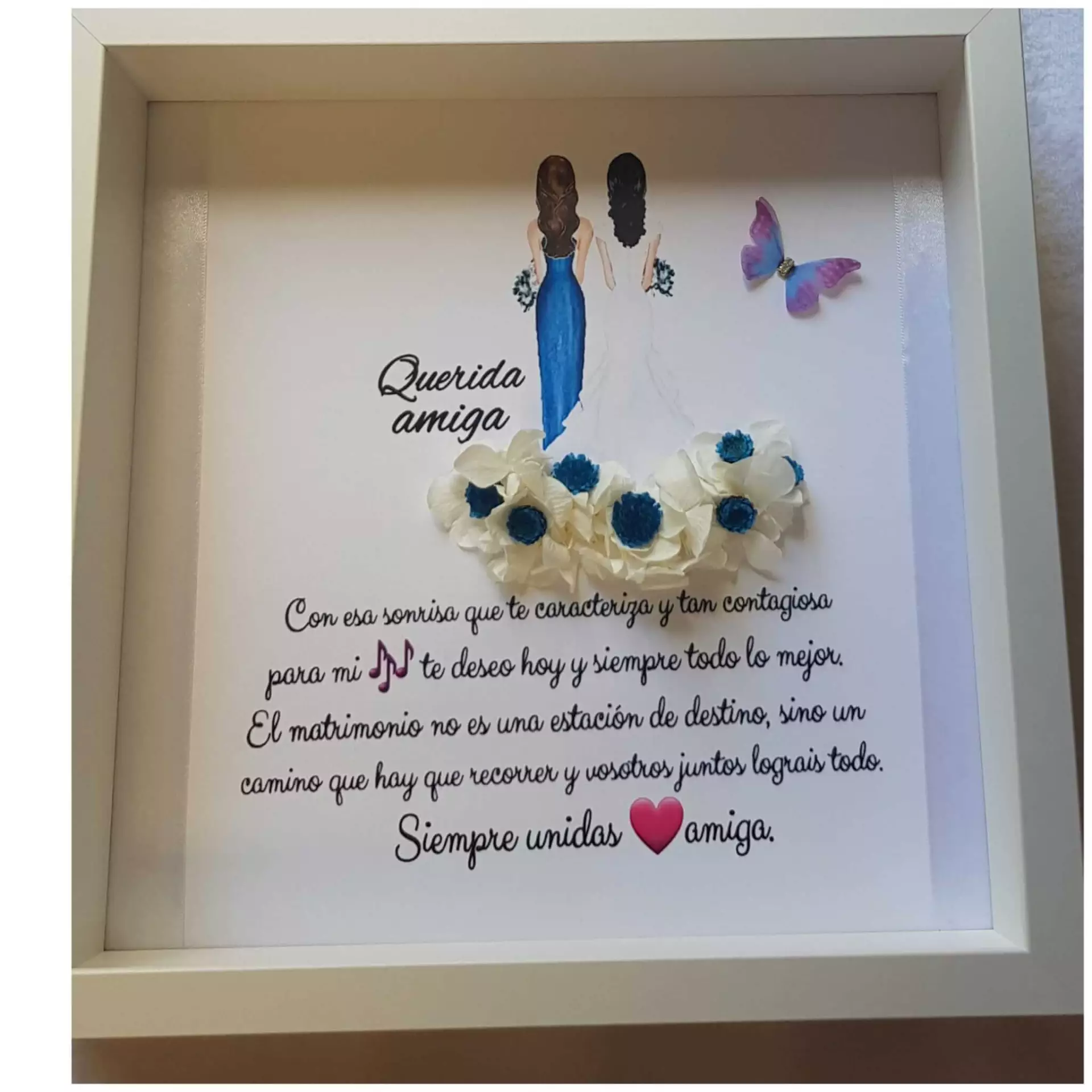 • Cuadro decorado con una preciosa mariposa 3d,el regalo regalo perfecto para una futura novia (la novia lleva el vestido con toques de purpurina y flores preservadas)