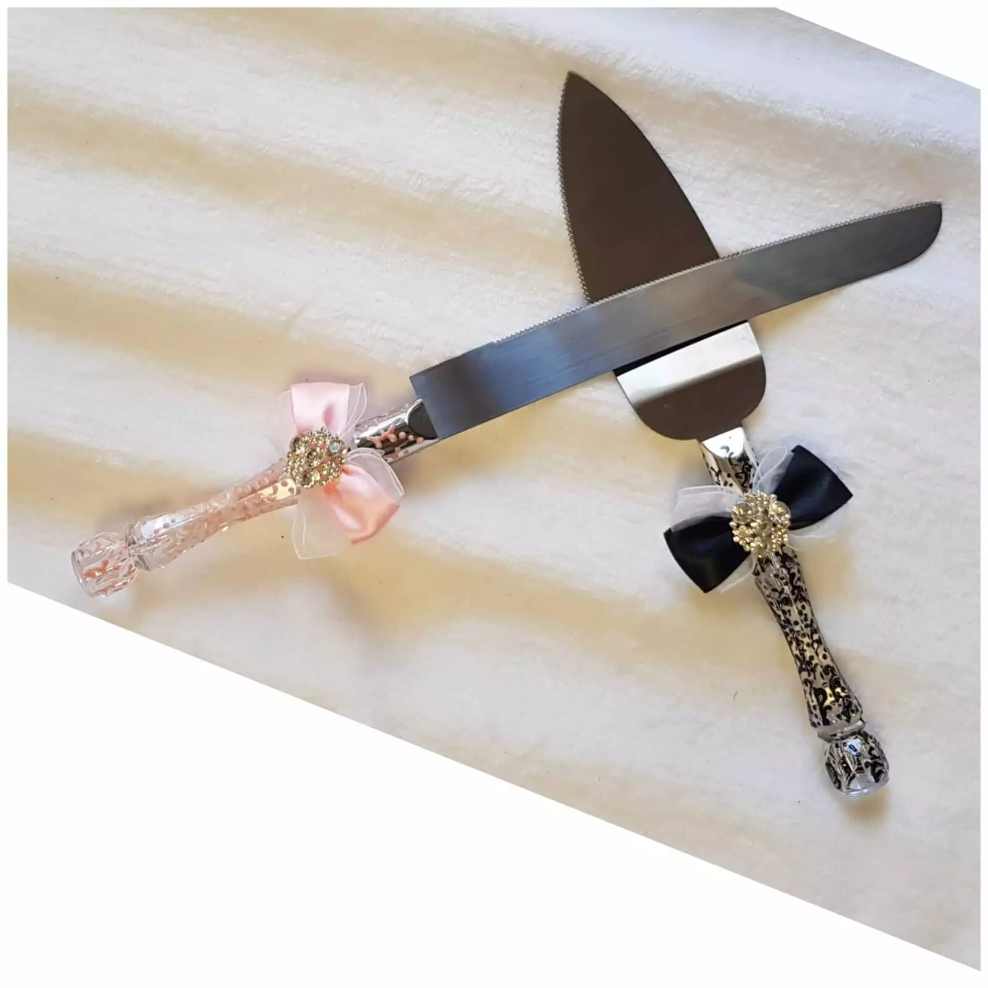 Cuchillos y palas decorados con pintura en relieve,lazos,brillantes,cuerda de yute etc.